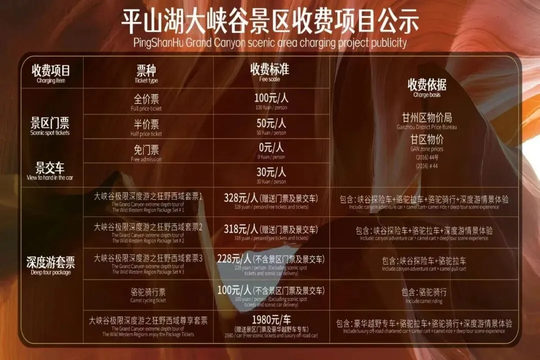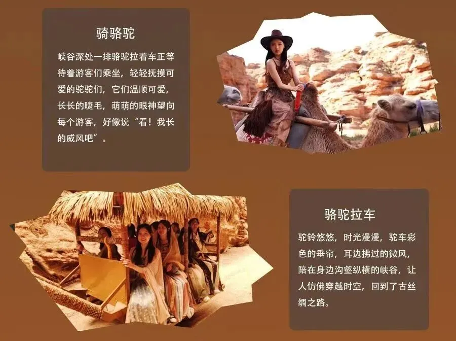 深度游套票:328元/人(含门票+观光车+峡谷探险车+骆驼骑行+骆驼拉车,覆盖长线游览路线,解锁全部特色项目);