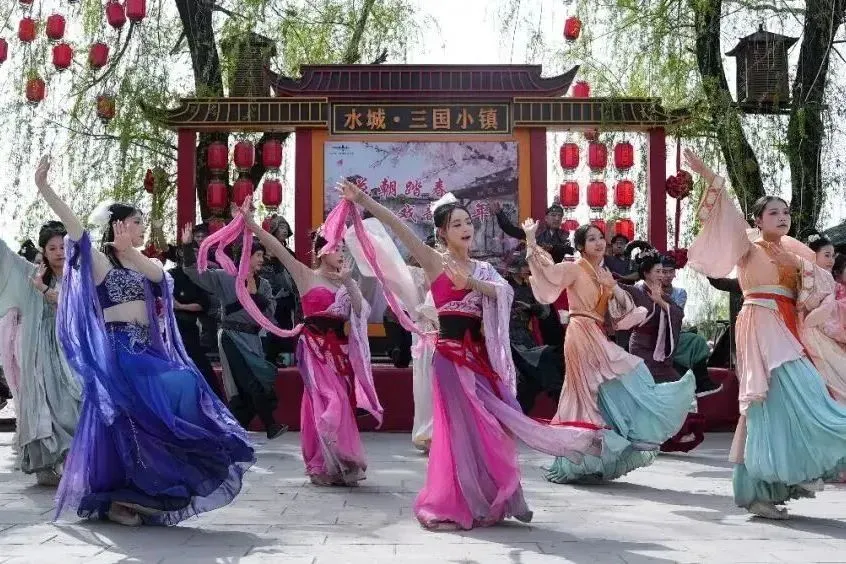 水城·三国小镇以“花朝踏春·戏韵千年”为主题,推出非遗秦腔、非遗铁花、花朝盛景、飞龙飞凤表演、汉服游船、萌宠娱乐等活动。五一期间更有大型沉浸式交互演出《风起三国》,——以五丈原之战为背景,你可以化身“谍战密探”,亲历诸葛司马的权谋博弈,参与NPC互动,完成任务还能兑换“银票”!这里集非遗展演、互动剧场、光影秀于一体,让你在刀光剑影中感受三国豪情,在花朝月夕下解锁沉浸式假期的无限乐趣!