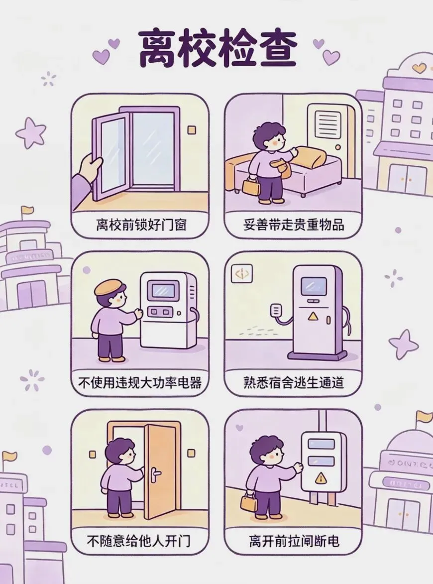 离校前检查宿舍门窗是否锁闭,确认水电总阀已关闭。