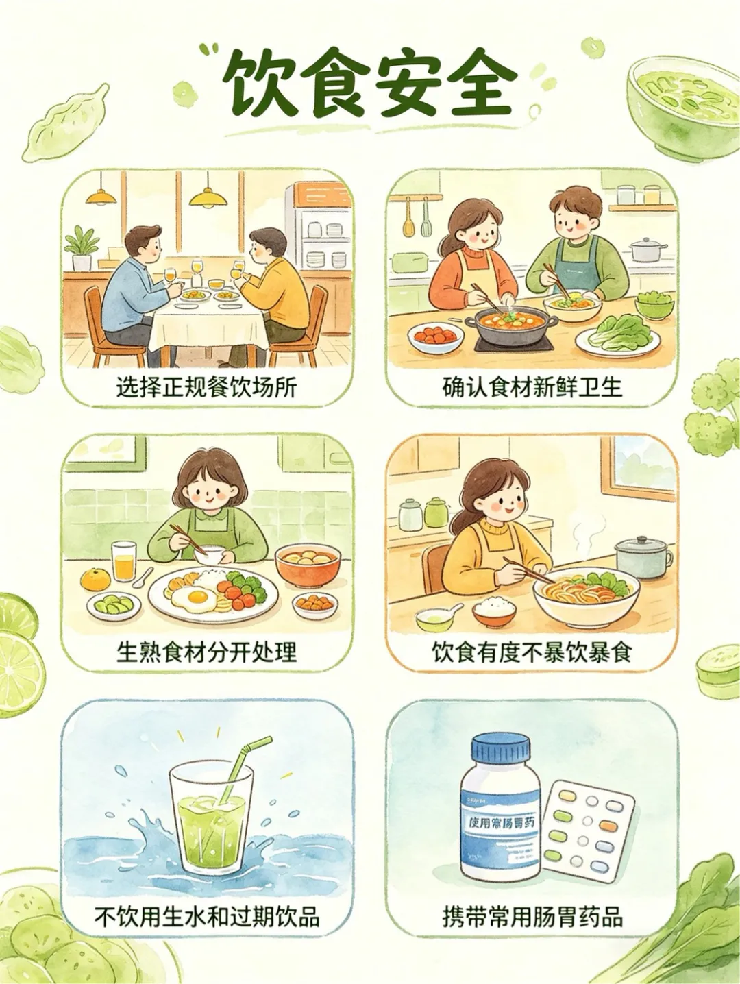 不饮用生水和过期饮品,随身携带肠胃药品。