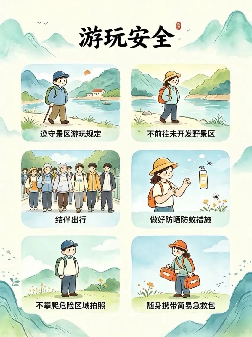 做好防晒防蚊措施,随身携带简易急救包,应对突发状况。