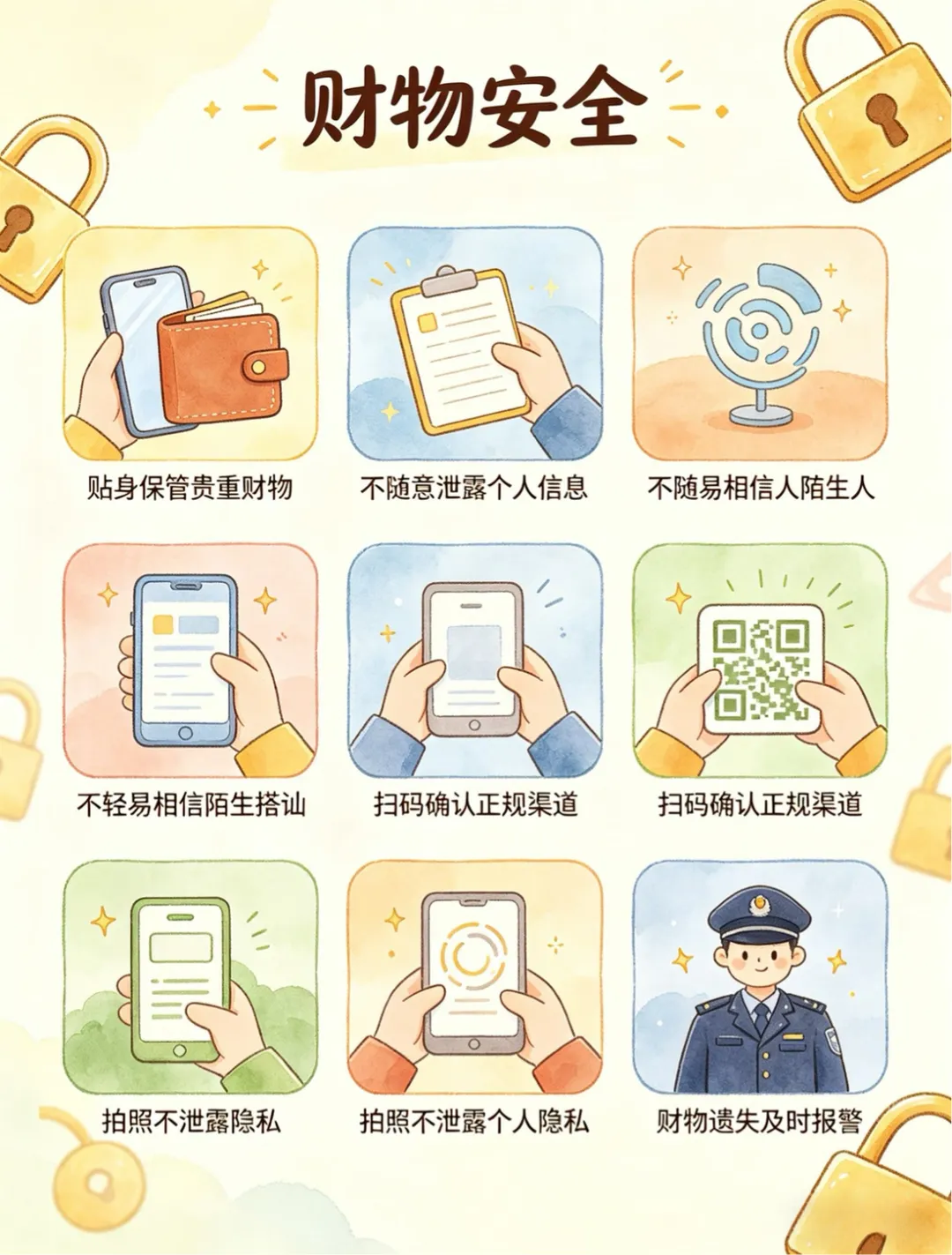 不轻信陌生搭讪,扫码付款前确认正规渠道。