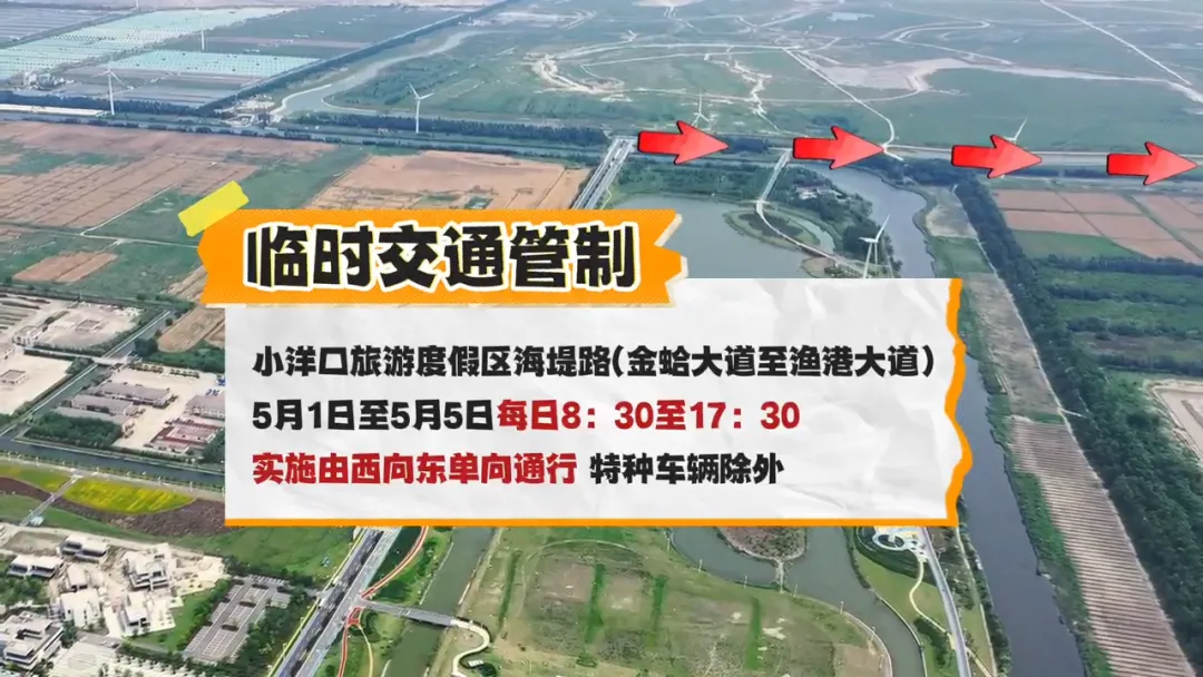 如东县小洋口旅游度假区海堤路(金蛤大道至渔港大道):2026年5月1日至5月5日每日8时30分至17时30分,实施由西向东单向通行,120救护车、消防车等特种车辆除外。