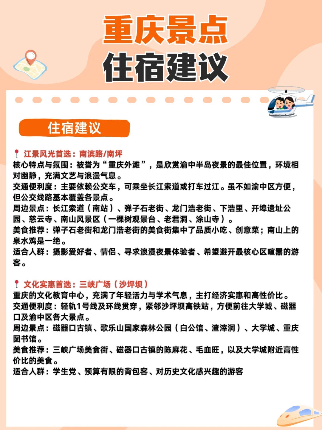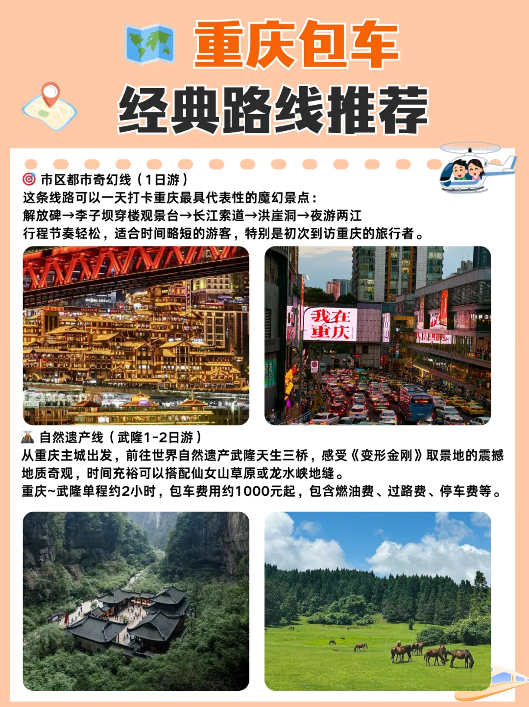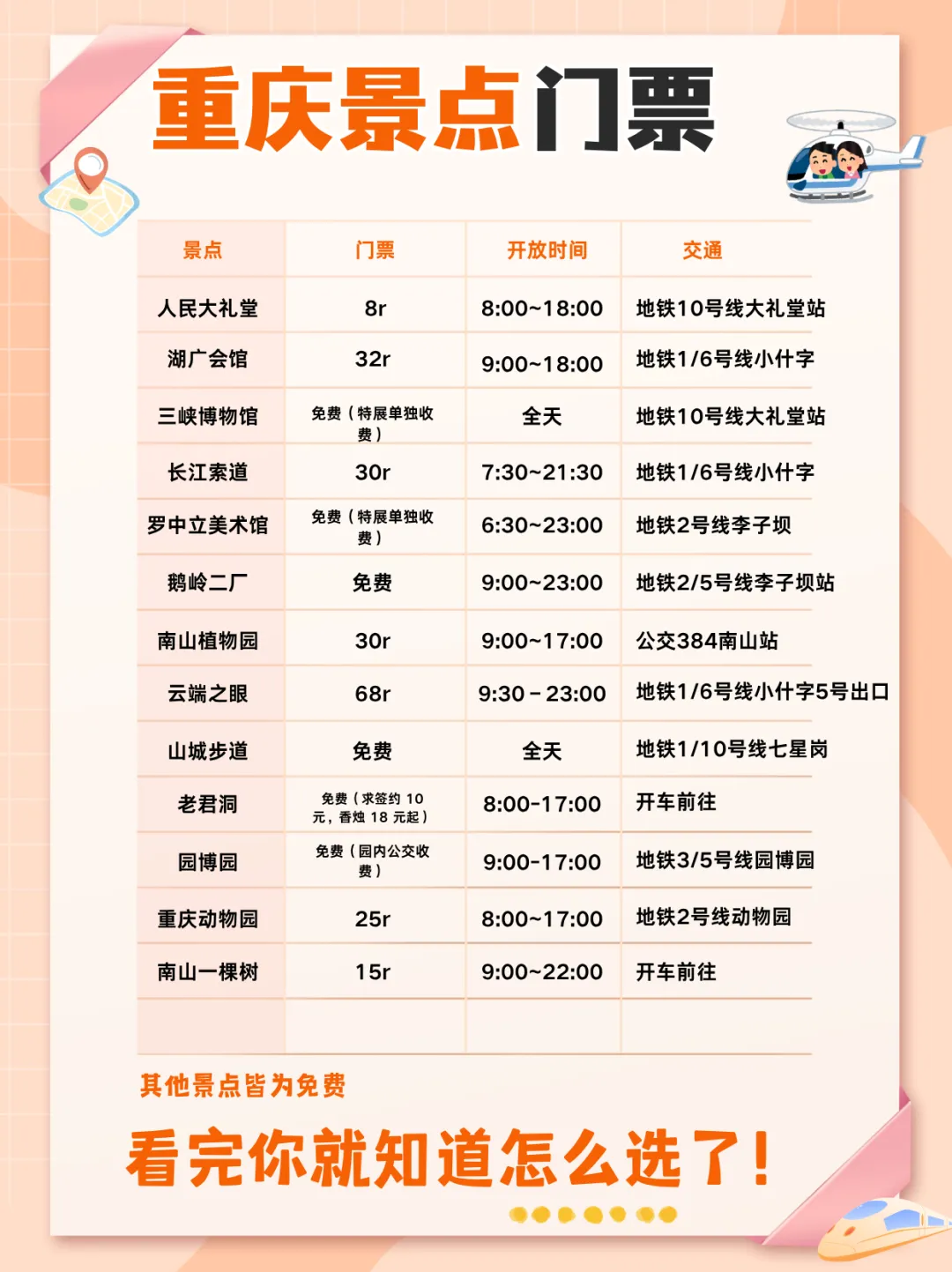 🏆 必打卡TOP排行榜 洪崖洞|现实版千与千寻,19:30亮灯,免费 解放碑|城市地标商圈核心,免费 长江索道|空中巴士瞰两江,单程20-30元(初次来可以去) 李子坝|轻轨穿楼名场面,免费(初次来可以去) 云端之眼|高空俯瞰两江四岸,约68元 鹅岭二厂|工业文艺圣地,免费 十八梯/山城巷|崖壁老重庆脉络,免费 武隆喀斯特|天生三桥自然奇观,100-150元(必去) ⚠️热门景点提前公众号预约,长江索道买单程即可!