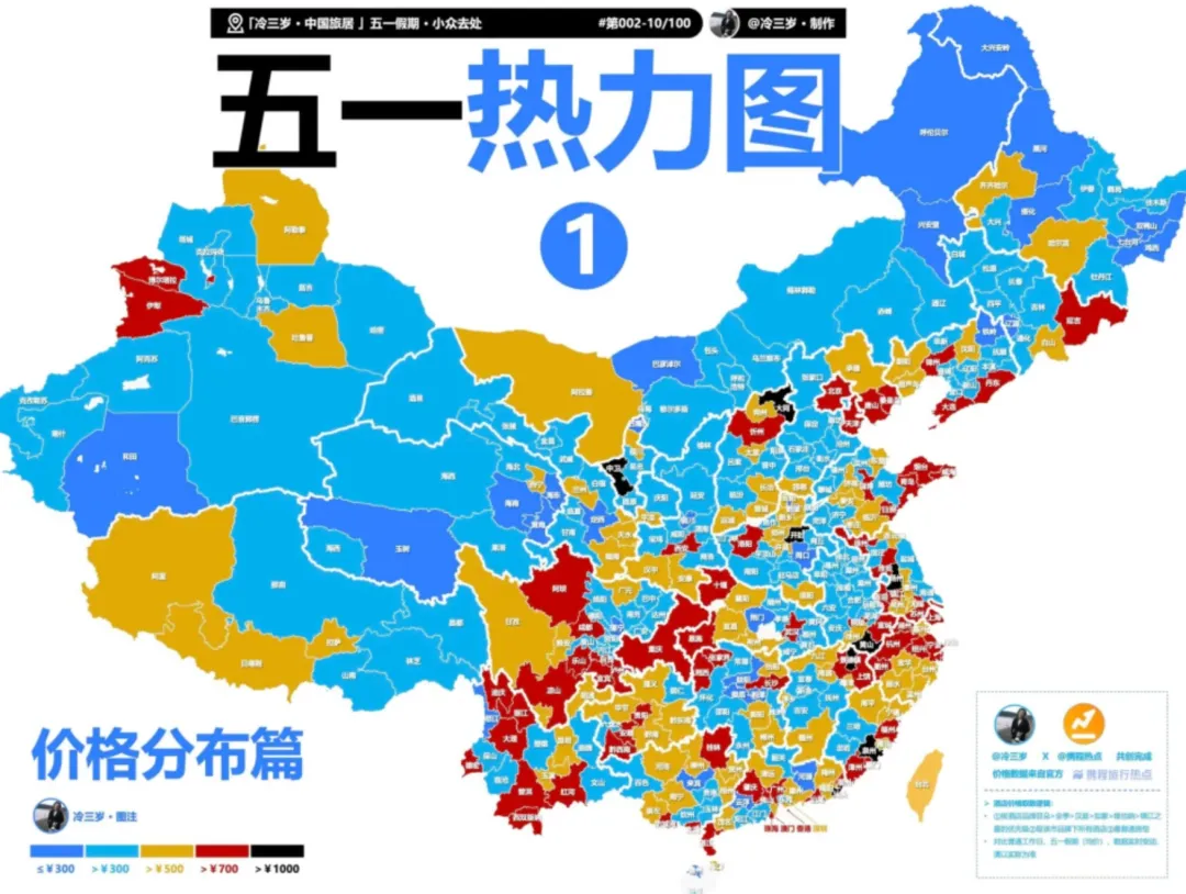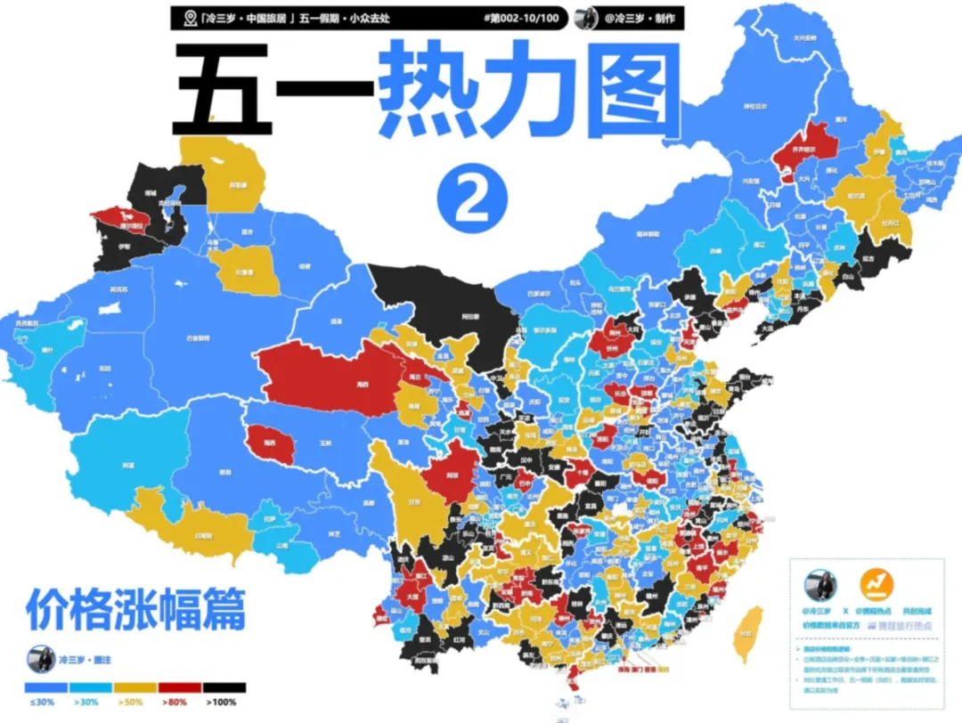 五一假期全国各地酒店涨幅图,颜色越深,涨幅越大👇