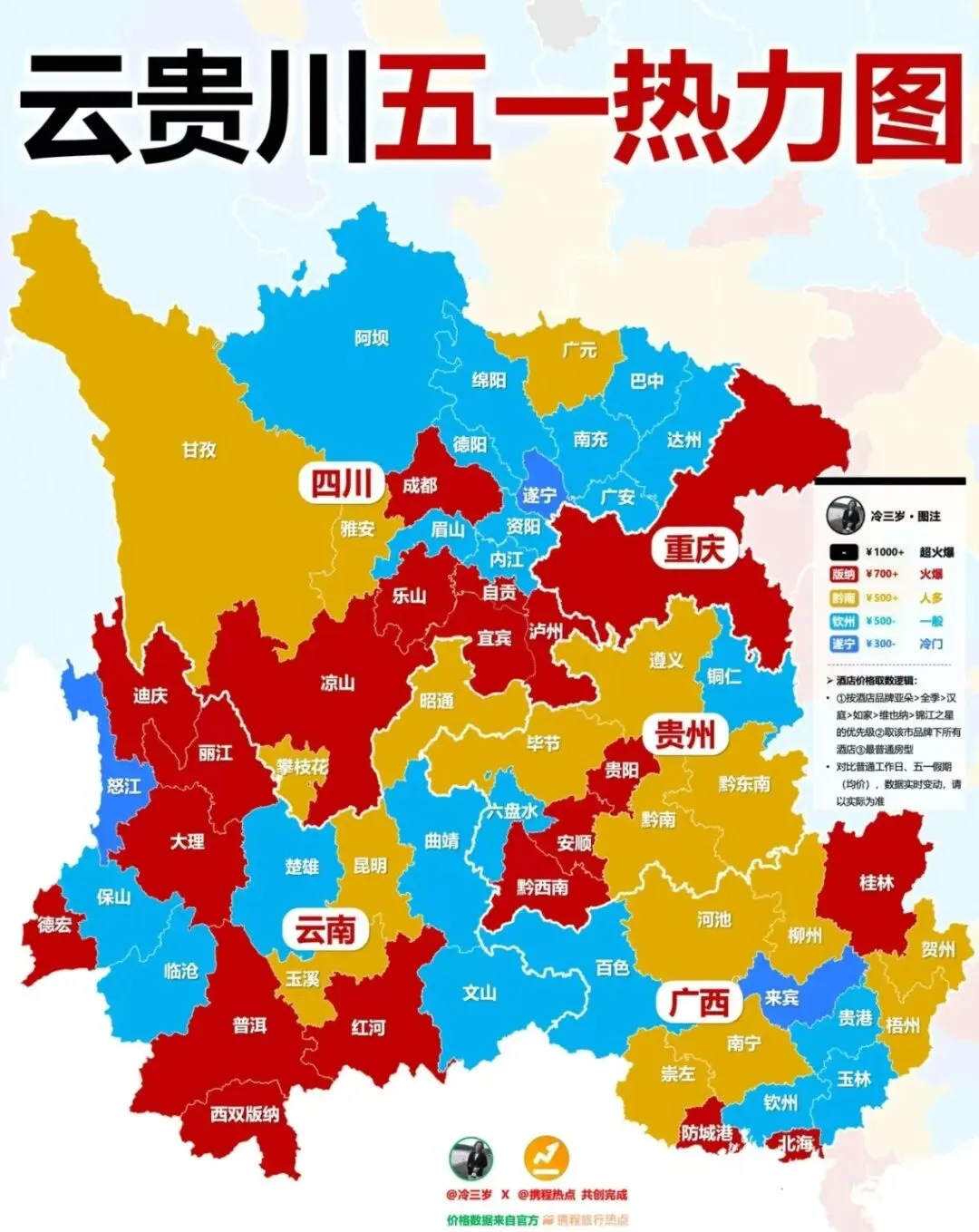 1、云南、四川很火,隔壁重庆也是热度不减,以及张家界、十堰、恩施、湘西也是热门;