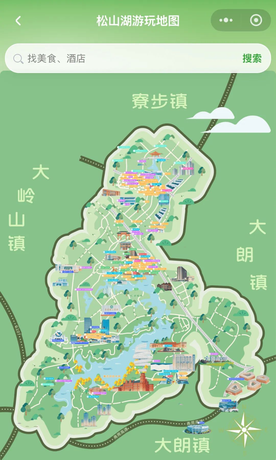 松山湖游玩地图:全域电子地图,支持景点定位和周边设施查询。商圈、便利店、住宿、游玩,一目了然。
