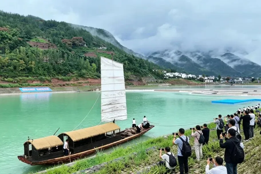 在纤夫文化走廊乘坐小木船体验纤夫拉纤