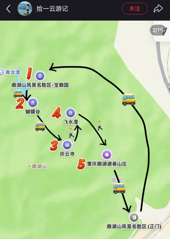 正门坐车 → 宝鼎园 → 蝴蝶谷 → 庆云寺 → 飞水潭(只能步行,有点累,有小瀑布) → 鼎湖避暑山庄 → 正门(@小红书up)