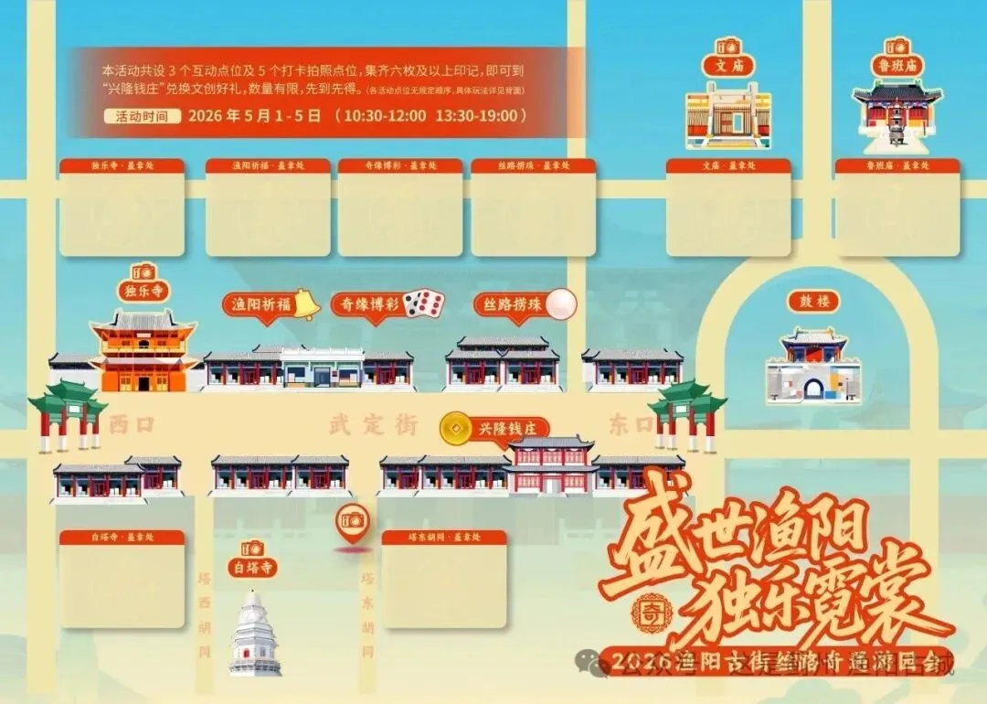 更有“银票闯关·古城探秘”趣味玩法,在兴隆钱庄(非遗展示中心)购买“渔阳锦囊”,即可获得文创徽章1个、渔阳银票10张、打卡地图1张,参与互动挑战、打卡五大景点集章,集齐6枚及以上匠心印章可兑换专属文创好礼。同时,蓟州非遗、民俗小吃、文创花车齐聚,塔东胡同漫游解锁古城烟火气,从早嗨到晚,好吃又好玩!