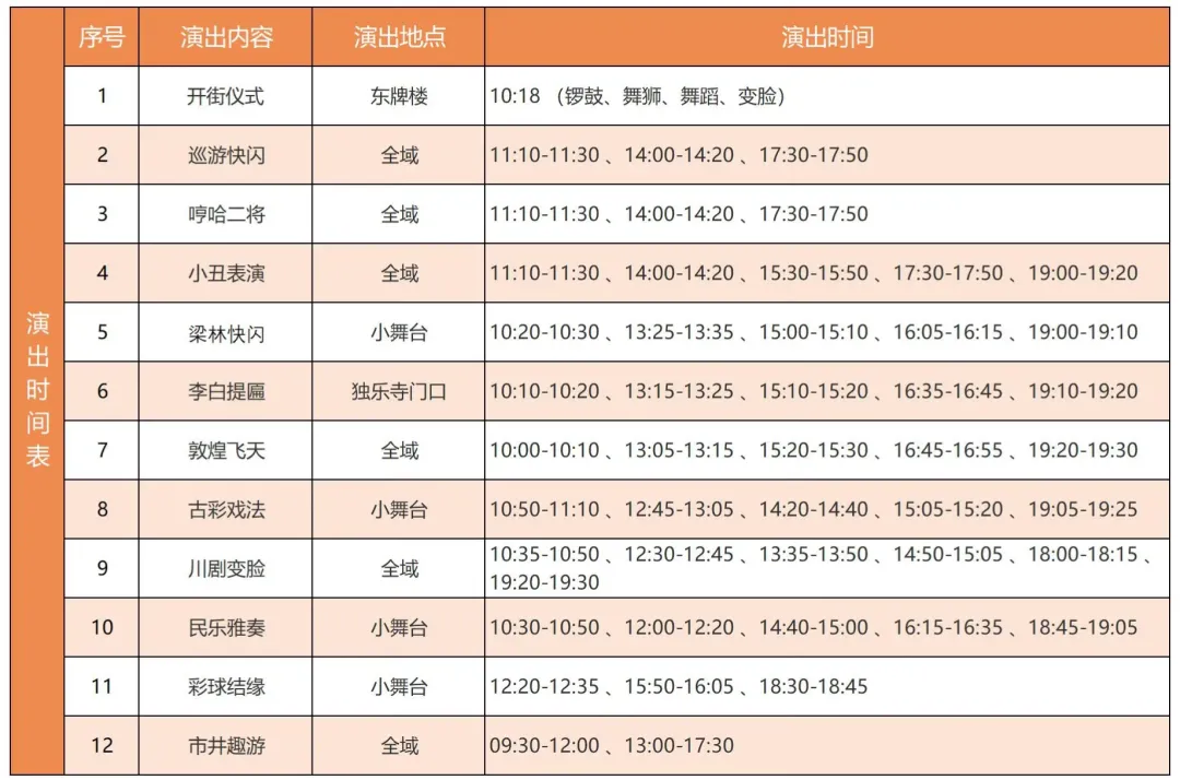 五福迎祥、乾隆机甲、侠影熊猫全天候互动;八旗战鼓、御驾迎宾、川剧变脸、霓裳羽衣(鼓上舞)等节目循环上演;还有锦衣侍卫、市井花郎、花车游春等实景互动,民乐雅颂、墨韵扇风等国风体验,全天游玩不重样。