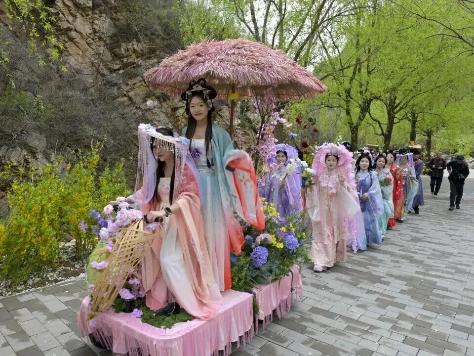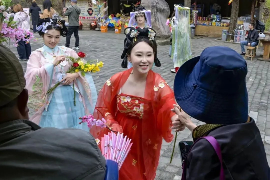 花神衣袂翩跹、探花郎儒雅随行,沿途赠花送祝福;国风舞蹈轮番上演,《青花瓷》《入画江南》等曲目,山水美景搭配唯美舞姿,氛围感拉满;还有古风小游戏互动,拍照出片率100%。