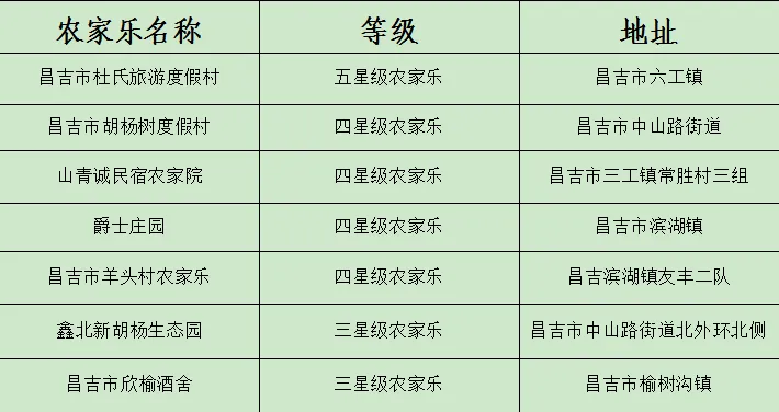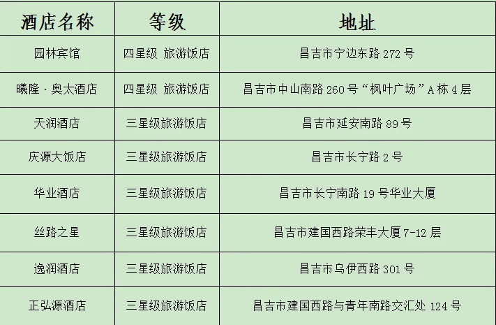 为方便游客自驾出行,以下为昌吉市星级旅游饭店和星级农家乐,环境舒适、停车便利,适配各条路线行程。
