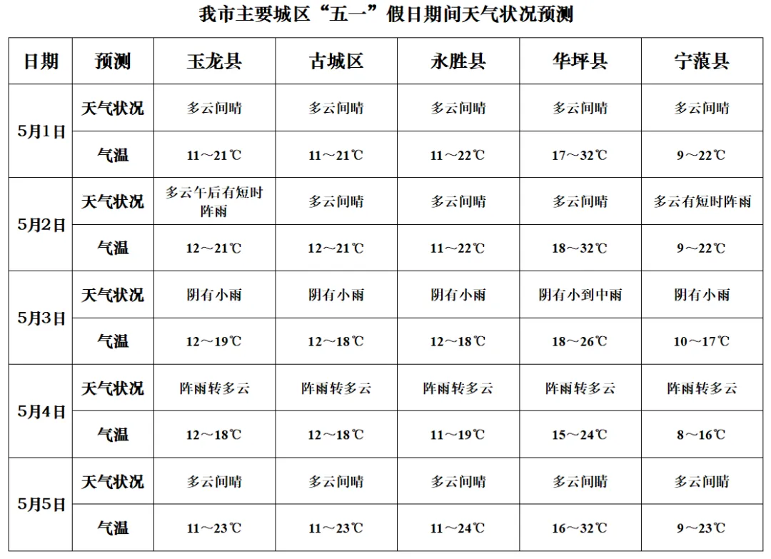 根据丽江市气象台预报,预计5月3~4日受冷锋切变系统影响,全市大部阴天间多云有小雨,局部有单点性中到大雨并伴有强对流天气,玉龙雪山地区有降雪,日最高气温累计下降4~8℃;假期其余时段以多云间晴天气为主,昼夜温差大。请携带雨具,备好保暖衣物。
