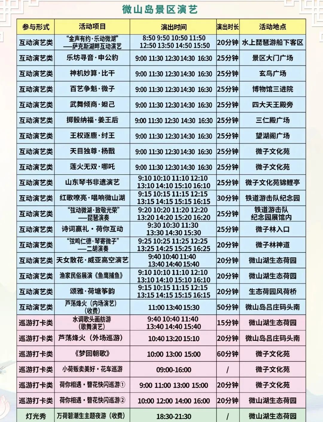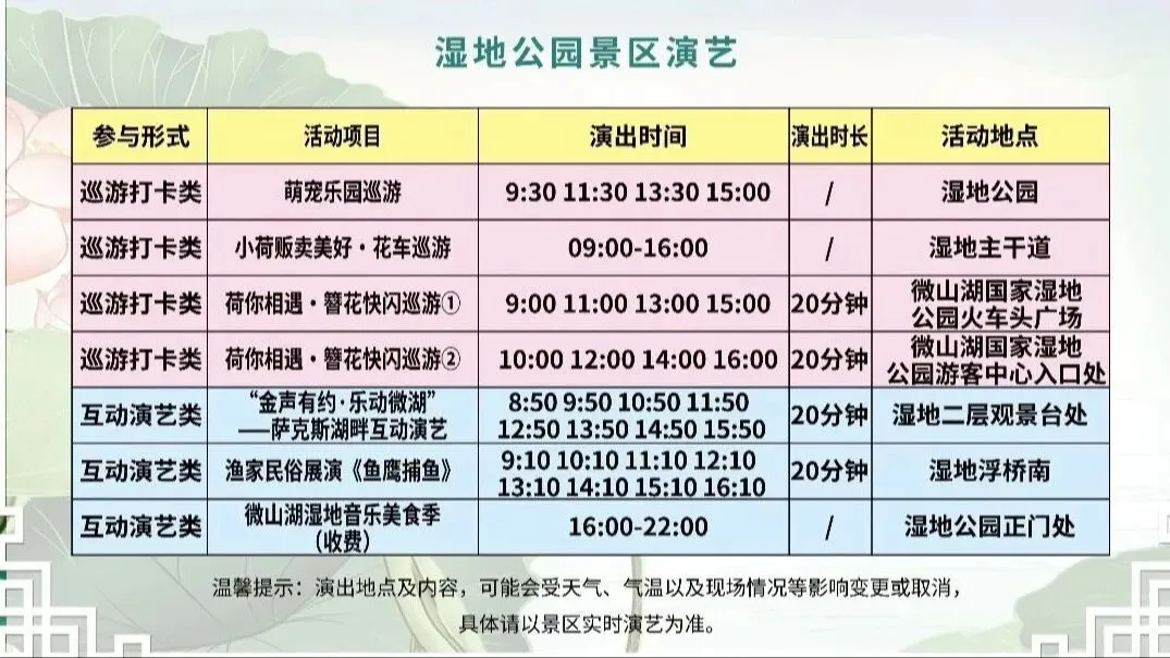 “水下森林”精品游船观光、微山湖湖鲜美食暨农产品市集、生态研学与湿地科普、独山岛文化打卡与休闲体验、“最美水下森林”摄影短视频大赛、夜间“相亲大会”活动;在码头、汉服馆、乡村会客厅周边有NPC表演;开放百姓大舞台, 游客可上台表演。