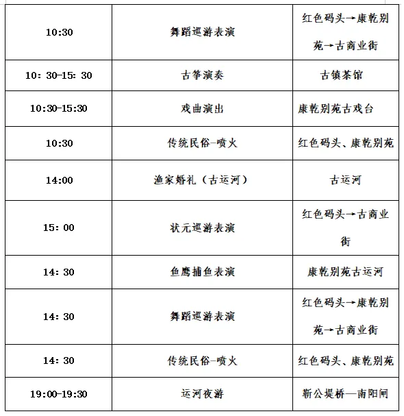 上午:抵达运河里景区→游览运河里艺术街区→打卡春夏秋冬四大演艺区→逛特色市集