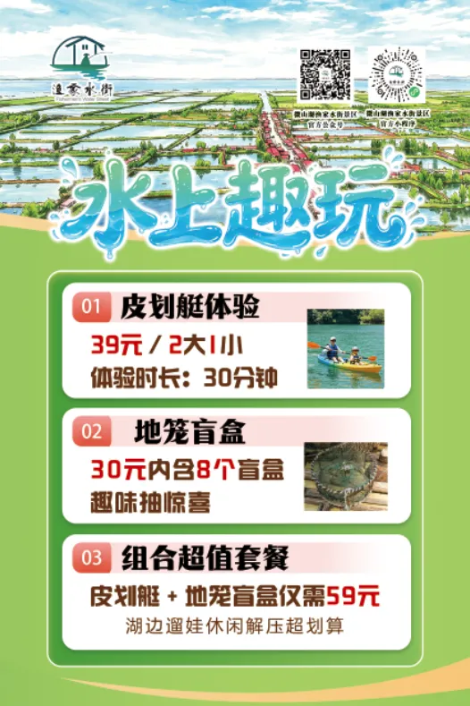 收费活动:渔绘童颜面部彩绘(据图案复杂度收费)、一苇渡波皮划艇+湖底探秘地笼盲盒(联合收费59元/人)、花漾巡游花船体验(15元/人,汉服NPC+大鼓互动)、虾兵点将小龙虾垂钓(35元/人,1斤内可免费带走)、湖鲜灶王地锅DIY、乘风破浪画舫船游大湖(30元/人,满员发船,含专业讲解)。