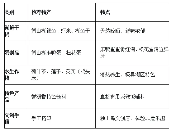 特产种类:分为两大类,湖鲜类(真空包装咸鸭蛋、微山湖麻鸭、干湖鱼、虾干等,方便携带)、手工艺品(芦苇编织筐篮、芦苇画、传统船模等,均为本地手工制作,兼具实用性与纪念意义)。