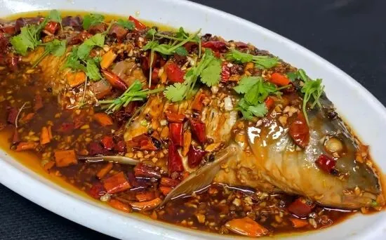 香辣鲤鱼是湖区待客必不可少的传统风味菜品。选用微山湖特产鲜活的四鼻鲤鱼为原料,去鳞、内脏后欹上一字花刀,投入烧开烹好的鱼汤中,炖熟,调味盛入鱼池中,然后把干辣椒、花生米拍碎,加芝麻油炸后,浇在炖好的鲤鱼上。这样就把鱼肉鲜嫩、香辣扑鼻的四鼻鲤鱼便做好了。