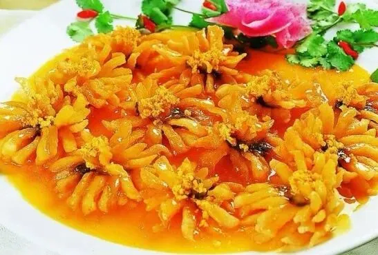 菊花鱼是一道传统名菜,成菜宛如朵朵盛开的菊花,造型逼真,色泽鲜艳,散发出阵阵诱人的芳香;吃起来口感外酥里嫩,酸甜爽口。
