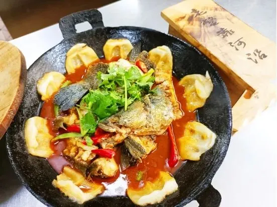 老鳖靠河沿,将现捕的活鱼用湖中水在大铁锅中炖,锅边贴上手掌大小的面饼,鱼熟了,锅饼也蒸熟了。因锅贴状似老鳖,才取名叫“老鳖靠河沿”。吃着鱼就着面饼,喝着鲜美鱼汤,一顿饭吃得有滋有味。