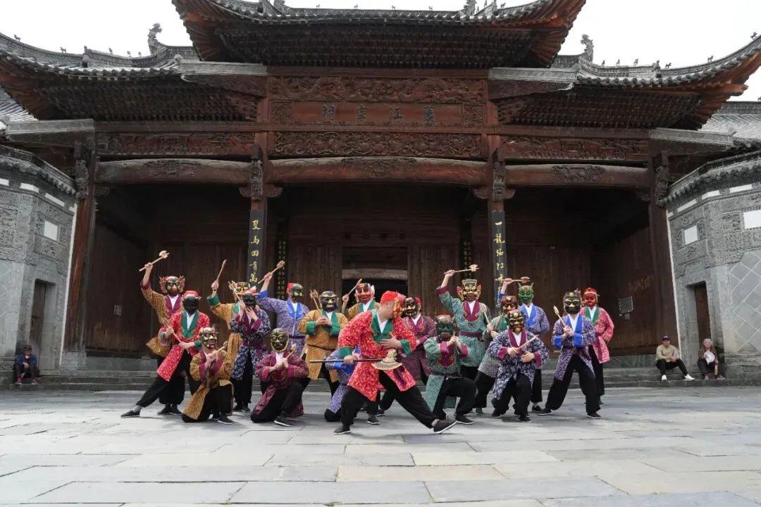 婺源傩舞素有“中国舞蹈活化石”之称,历史源远流长。舞者佩戴古朴神秘的图腾面具,踏鼓起舞,舞姿粗犷苍劲、古朴庄重,每一个动作都承载着驱邪纳吉、祈福安康的美好寓意,诉说着千年徽州的民俗信仰。
