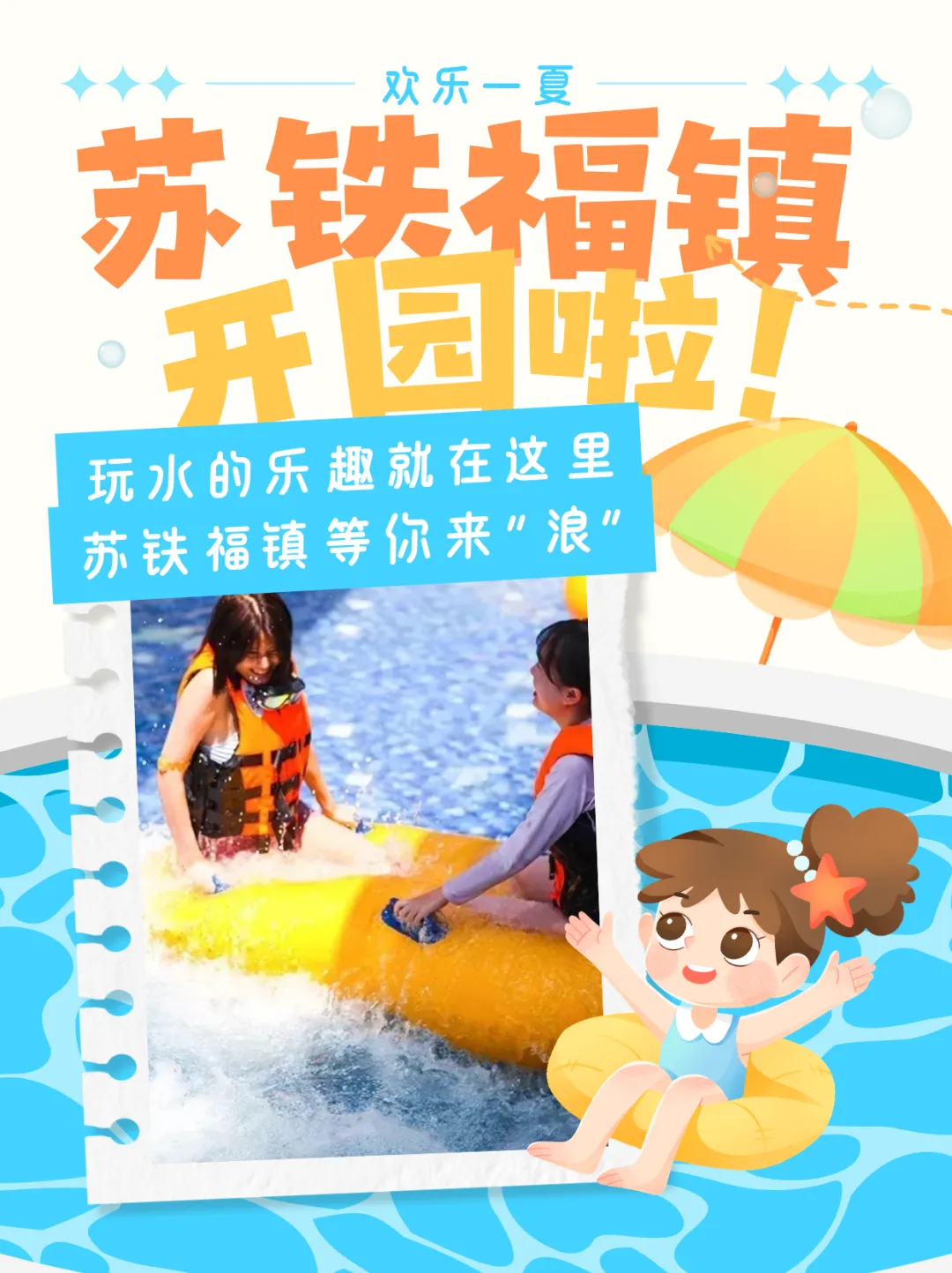 苏铁福镇水上乐园,面积2000㎡+。这里有高速滑梯、彩虹滑梯、海浪池、冲天回旋、儿童戏水池 、自由泳池、室外水乐园,在超级造浪池体验多维冲击,尽享神秘的水上之旅~