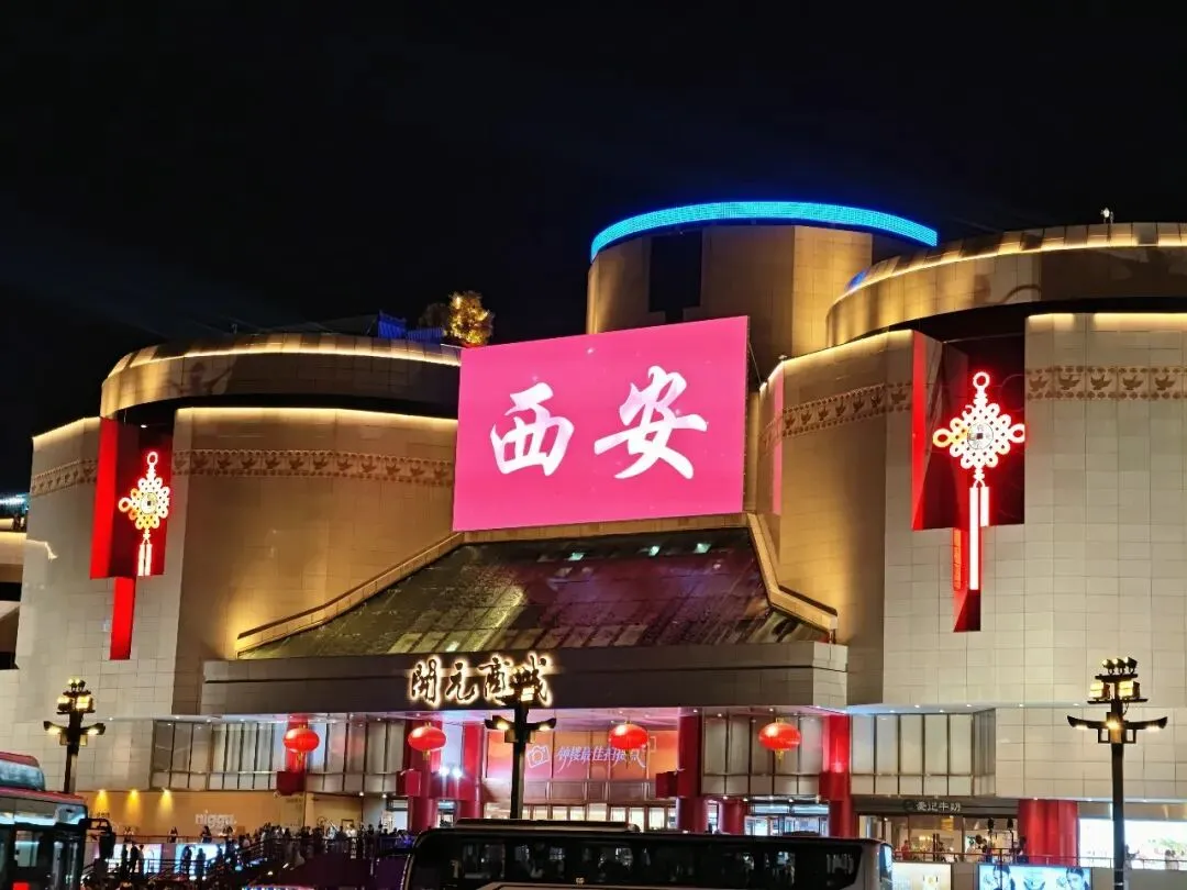 走出“大悦城”商场后,往大雁塔北广场走,找到“西安非遗大剧院”。