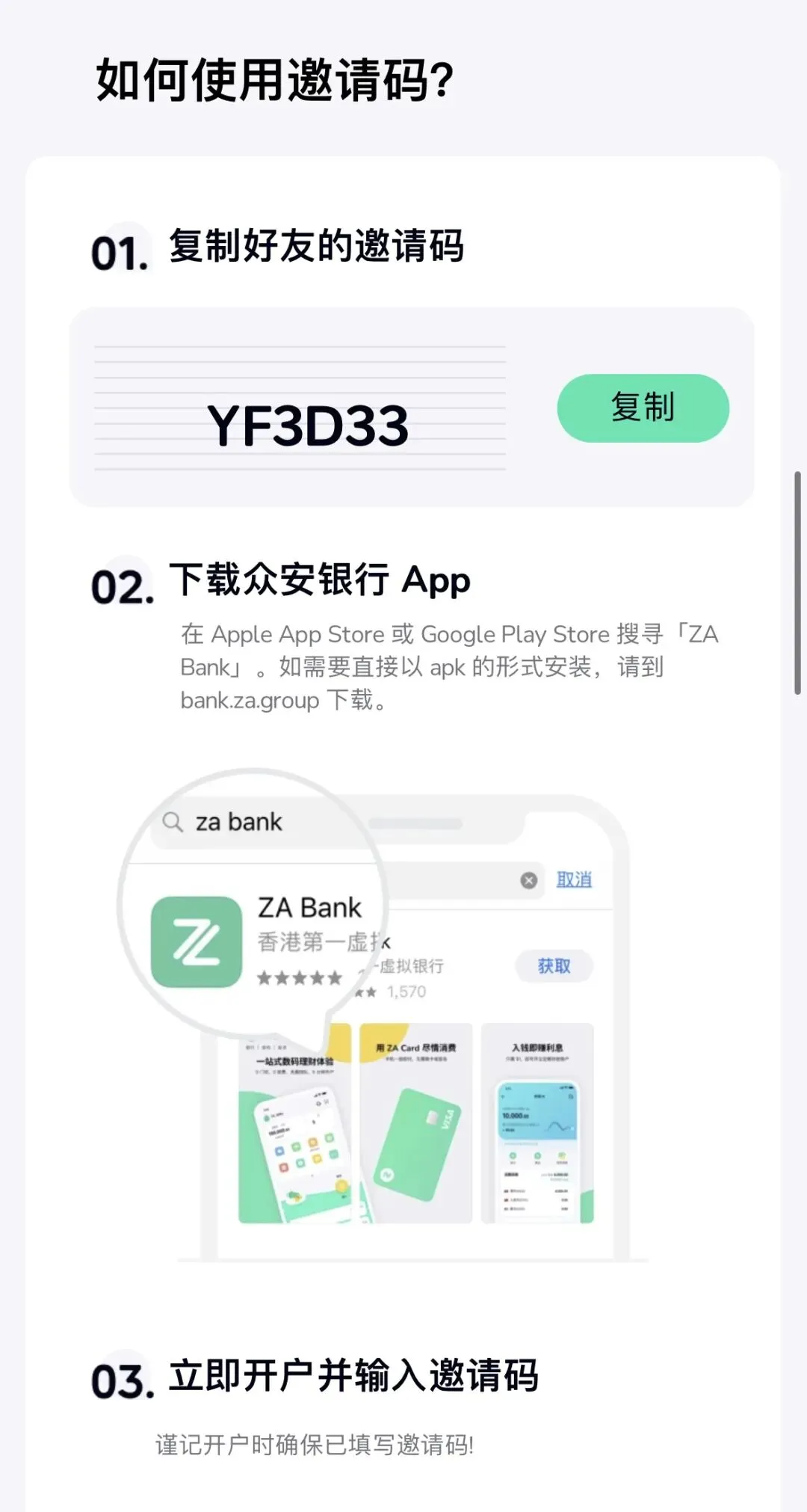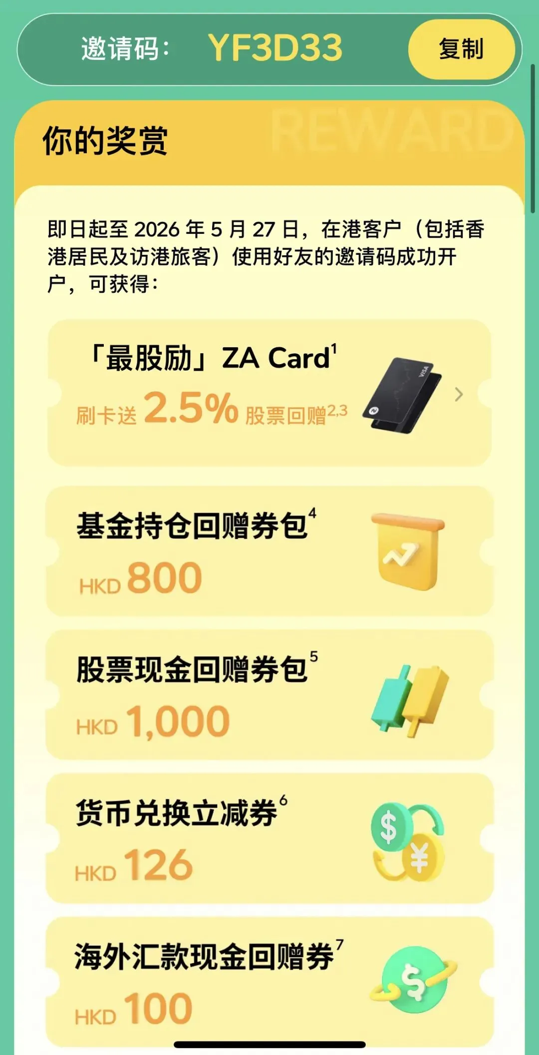 众安银行ZA Bank申请非常简单,抵港后全程线上完成,手机客户端使用体验人性化,是目前最符合内地使用习惯的香港银行App。 新开户使用专属福利邀请码:YF3D33,有额外福利奖励💰 强烈建议到港先申请众安ZaBank,并在通过后立即登录App,同时开通众安投资账户(包括基金和股票),这个必须所处位置在港才可以开通,可以参加众安的拼团,有更优惠的佣金和消费等福利,还有送的基金+股票现金回赠券,可谓大羊毛,即使不使用也不扣费,没有任何费用!