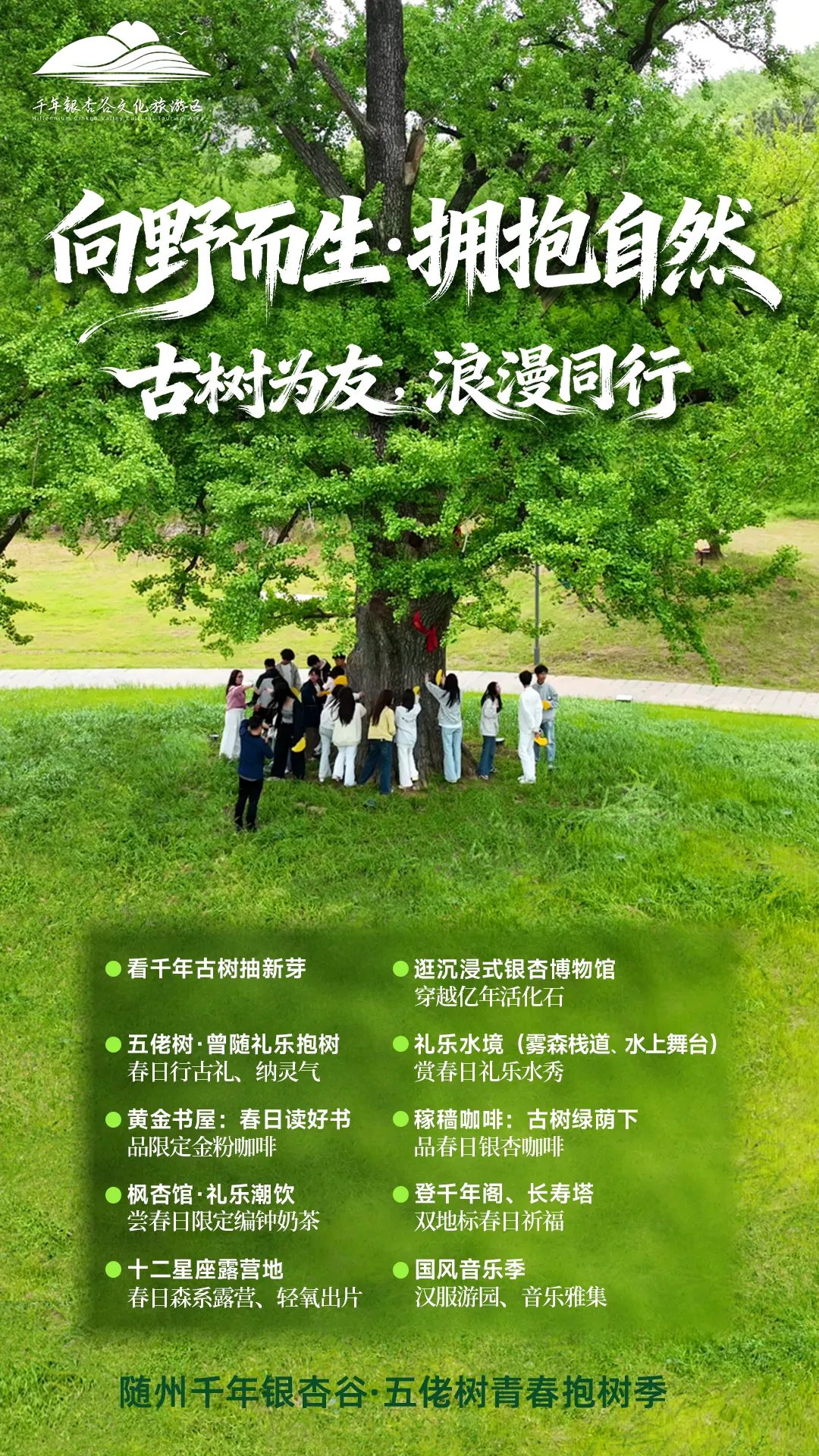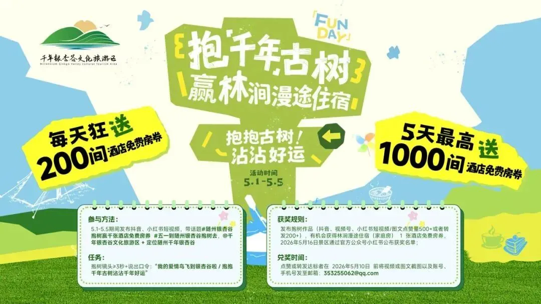抱一抱千年古树,沾一沾千年好运。发布抖音/小红书短视频,带话题 #随州银杏谷抱树赢千张酒店免费房券 #五一到随州银杏谷抱树去,并@千年银杏谷文化旅游区,定位随州千年银杏谷。