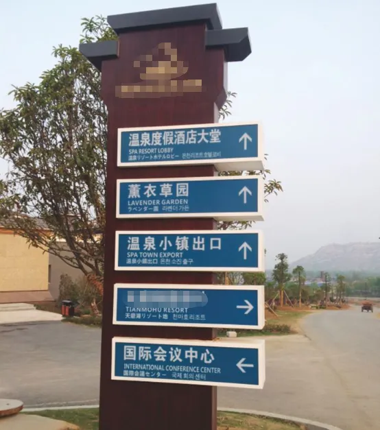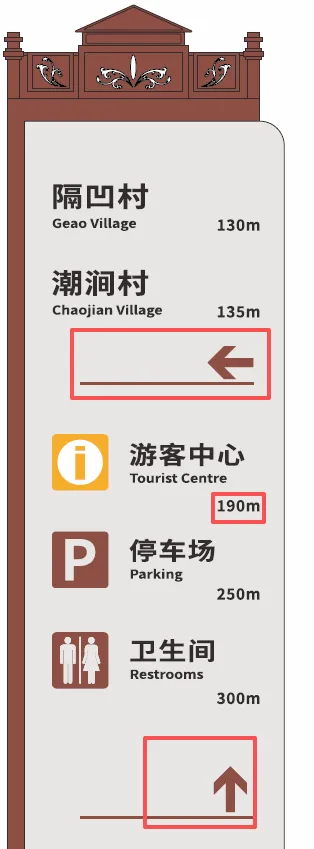 方向指引牌是游客在景区内移动的"核心依据",核心要求是箭头清晰、距离准确、信息明确,覆盖主游线、岔路口等关键节点。但这也是最容易出错的一类标识,很多景区都栽在这上面!