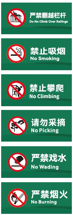 错误1:安全色乱用——警告标识(陡坡、悬崖)该用黄色却用橙色,禁止标识(禁止攀爬、禁止烟火)该用红色却用粉色,指令标识(紧急救援)该用蓝色却用绿色,混淆游客认知。