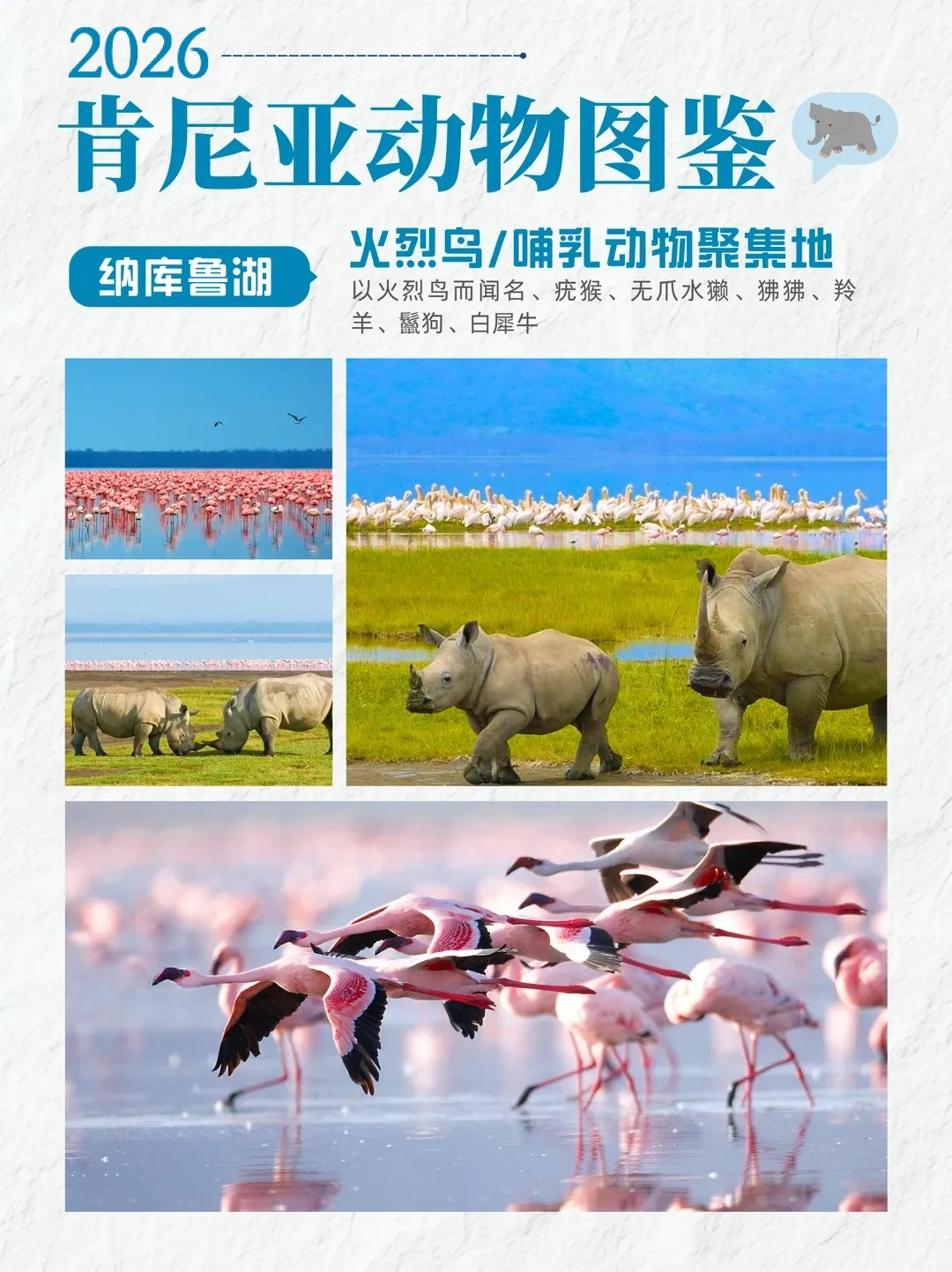 DAY5 | 纳瓦沙湖→纳库鲁湖 | 盐湖秘境, 野生物鉴 奔赴纳库鲁湖,打卡粉色火烈鸟群,观赏疣猴、水獭、白犀牛、鬣狗等多样野生动物。 |