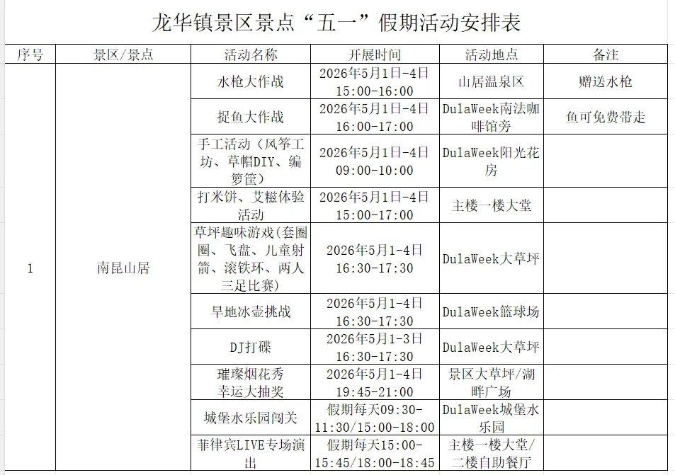 附:龙华镇景区景点“五一”假期活动安排表(南昆山居)