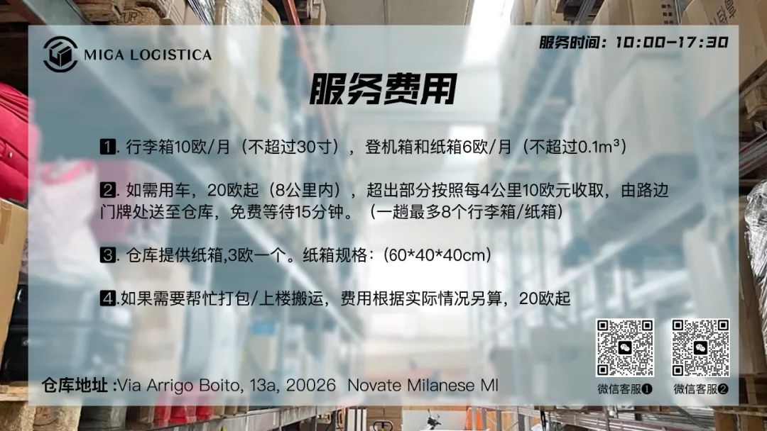 MIGA CLUB还注册了正规的物流公司“MIGA LOGISTICA”!致力于提供优质的行李寄存、海外仓储、国际物流等服务!包括代收快递,还有邮寄包裹到意大利各地及国内!各大展会期间可以代收展品,提供仓储及派送至展会现场的服务!