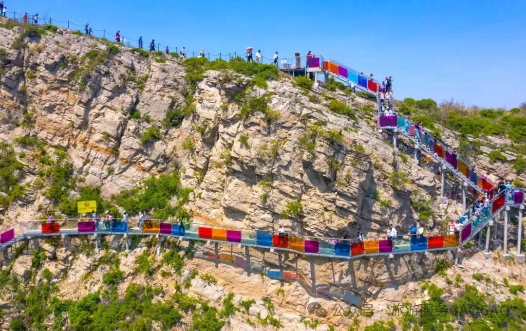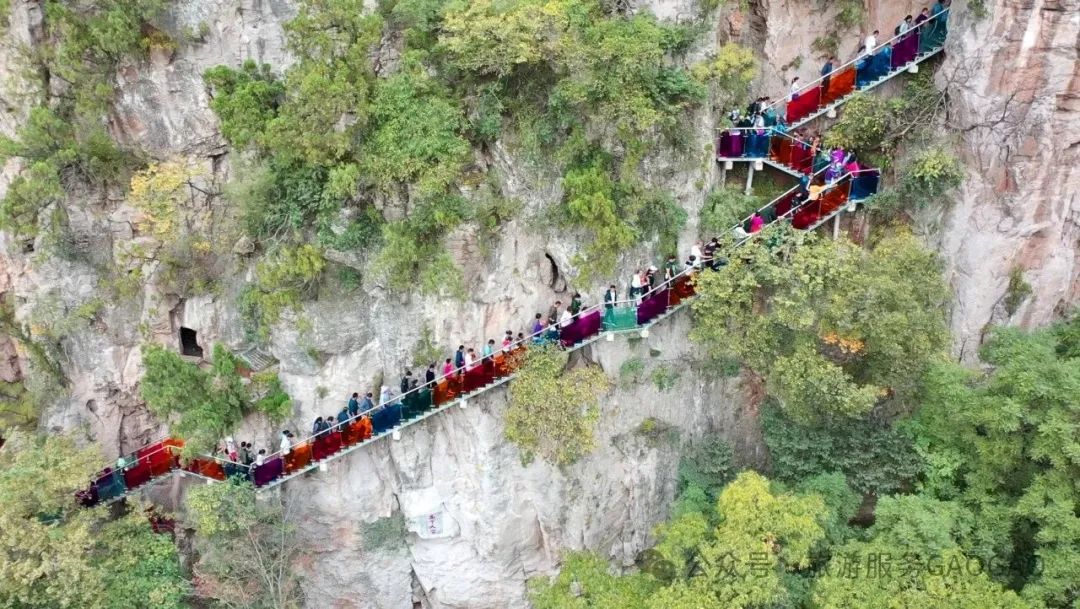 七彩琉璃悬空栈道:全长260米,依崖壁顺势而建,最高处距地面70余米,起点为天然的洞穴“一线天”。