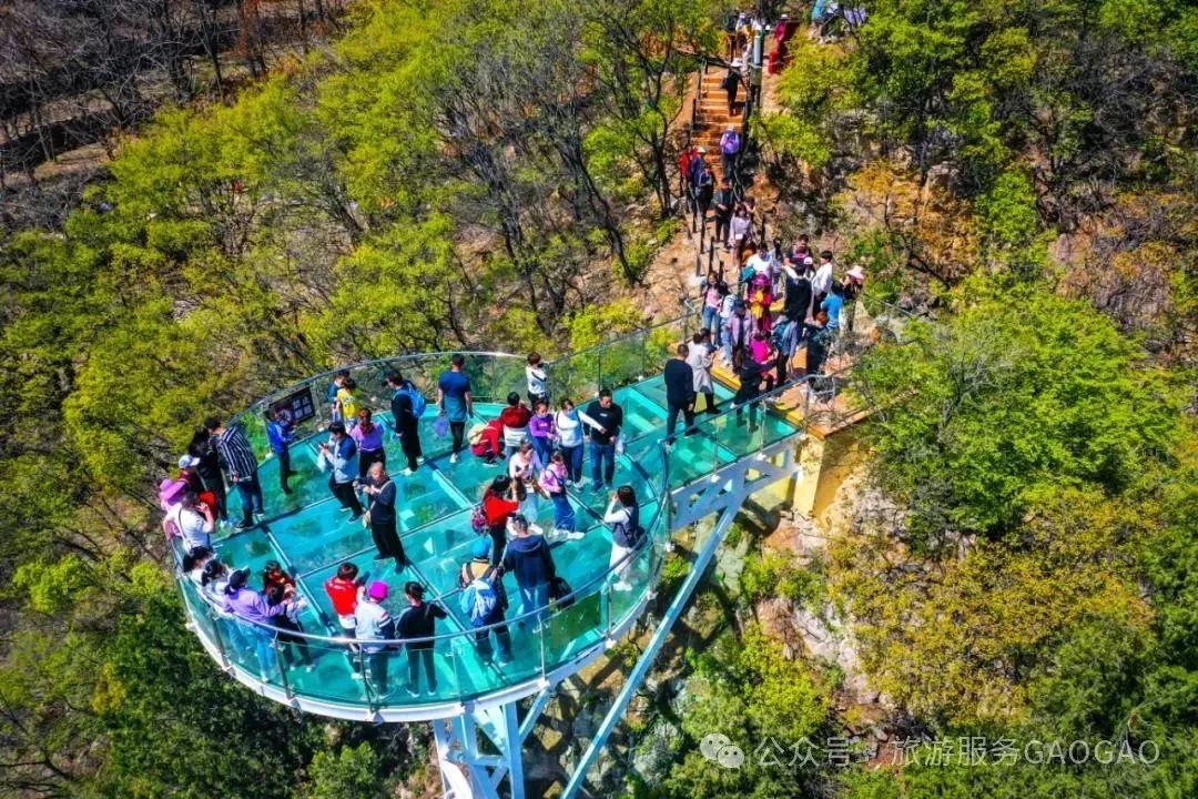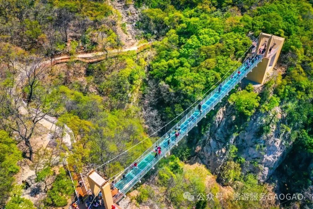 玻璃吊桥:全长77米,采用拉索玻璃结构。最高处离地面55米,是横跨悬崖之间的空中走廊,桥身采用透明度极高的钢化玻璃蓝天白云倒映其上站在山谷之间的悬空吊桥从高空更真实的感受到大山的壮观和秀丽。
