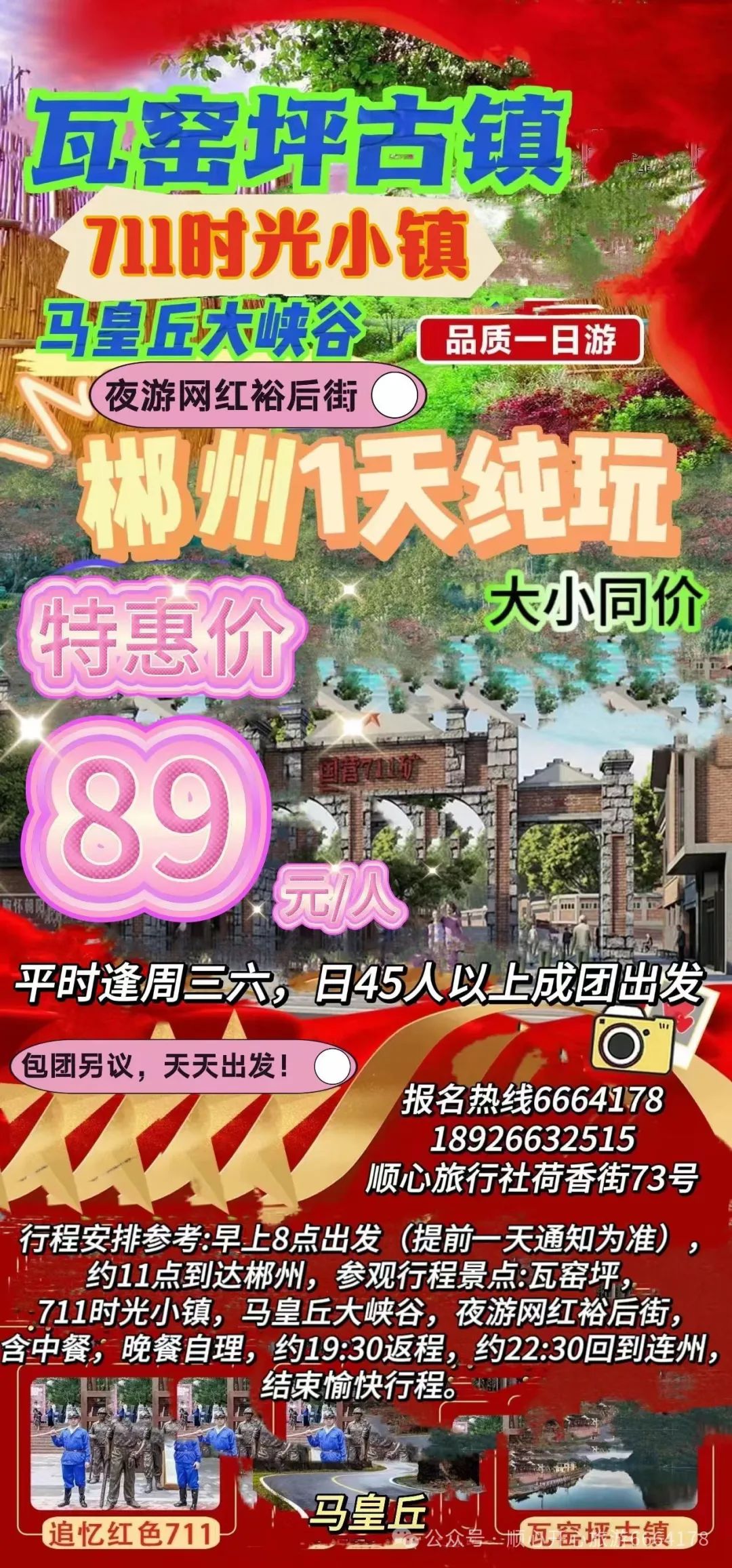 【集合时间】早上7:10集合,7:30出发。迟到的要发红包,5分钟以内,每分钟罚5元每分钟,5-10分钟罚10元每分钟,最多发75元红包。超过10分钟,恕不等候。