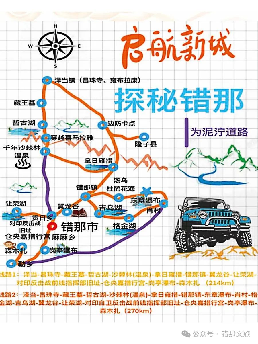 我们为您设计了两条自驾路线。线路1全长214公里,线路2全长270公里。这两条线路涵盖了错那市及周边地区的著名景点和地标,让您可以轻松游遍错那之美。