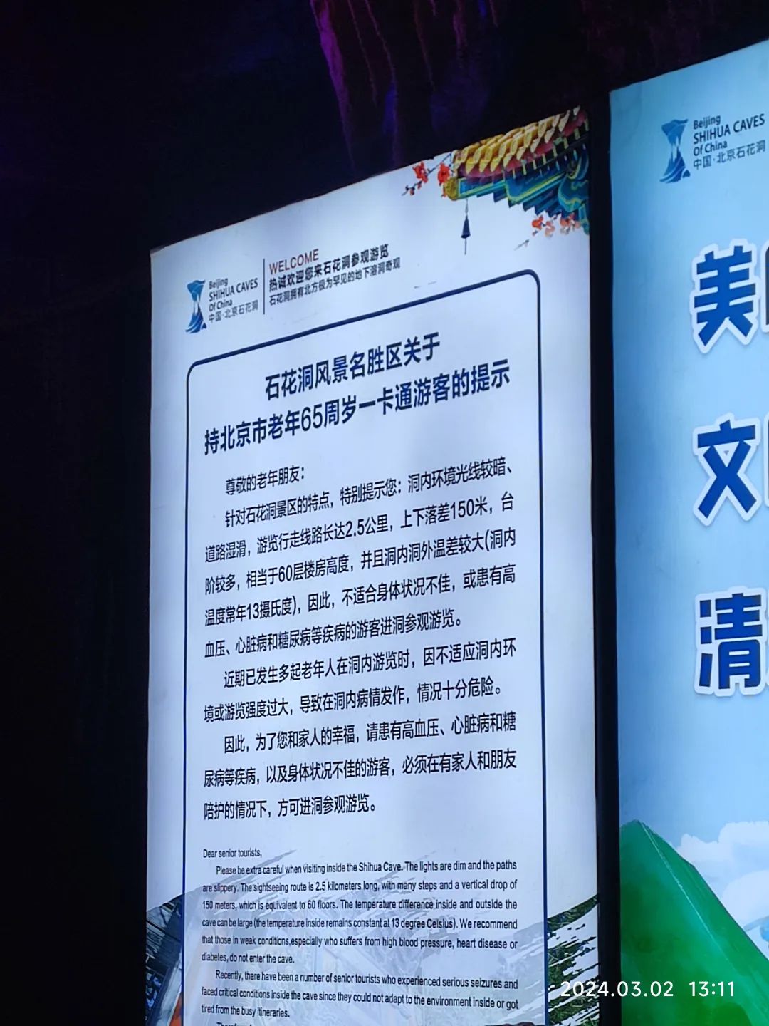 您现在的位置是:首页 > 国内旅游目的推荐 > 正文 国内旅游目的推荐 【北京市·石花洞景区】 admin2024年03月03日 18:07:29国内旅游目的推荐99 近期的再再再次感悟:身体健康是第一位。春节后第一次外出游玩——石花洞景区。挣扎许久终于克服了懒惰心理,还是化了妆穿了干净衣服,就此开启新一年的文体生活咯。今年也要多出门,多溜达,多晒太阳,多锻炼。石花洞,位于北京市房山区南车营村,距离城区50公里。石花洞有七层,层层相连,洞洞相通。洞中生有绚丽多姿、奇妙异常的石花,洞内的岩溶沉积物数量为中国之最,其美学价值和科研价值也可居世界洞穴前列,与闻名中外的桂林芦笛岩、福建玉华洞、杭州瑶琳洞并称我国四大岩溶洞穴。石花洞洞体分为上下七层 ,目前仅对外开放一至四层,全长2500米。现在一、二、三、四层已全部对外开放。洞内的自然景观玲珑剔透、华彩多姿、类型繁多,有滴水、流水等,地质奇观不胜枚举.四层洞壁被钟乳石类封闭,五层厅堂高大、洞壁松软,并且空气新鲜,七层则是一条地下暗河。地面湿滑,最好穿防滑鞋。在门口买票后,不允许自行进入,需要由讲解员带着队伍前往洞内参观。总共四层景观,台阶修建的非常完善,钟乳石形态多样,在灯光的映衬下,有点点壮观。洞内湿气重,通风不好,几乎全是台阶,不仅仅是汗流浃背,我一度要晕倒在返程的台阶上了身体素质亟待加强。。。另外就是,门票70元——这个价格在北京真的数一数二的贵! 转载请说明来源于"旅荐网",部分内容转载自网络,如有侵权请联系qlwl@foxmail.com删除 本文地址:https://www.15386.cn/post/16387.html 上一篇 景区|崆峒山 下一篇 【畅游西安文旅年票】秦岭主题卡,一卡在手 享受不一样的秦岭奇景 领略千年文化魅力 相关文章 岳阳华中大熊猫苑游玩攻略 山西旅游攻略,纯干货,值得收藏 上海迪士尼游玩攻略 | 带娃不费妈,1日轻松玩经典 2026春季川西旅行全攻略3-4月黄金期必看指南 福建小嶝岛旅游攻略 泉州旅游攻略(春假收藏版) 实拍,无锡吟苑紫滕美得不像话-附游玩攻略 揭阳市旅行新攻略!小众场馆与特色美食,惊艳所有游客 绍兴旅游攻略(不止古镇,超详细 4月江西旅游攻略来啦! 发表评论 取消回复 评论列表 这篇文章还没有收到评论,赶紧来抢沙发吧~