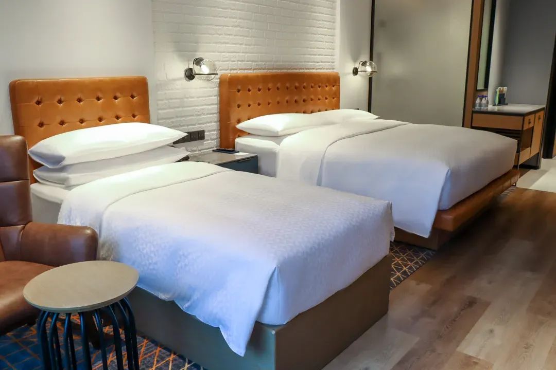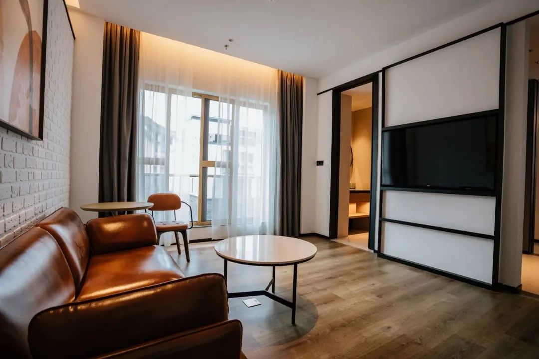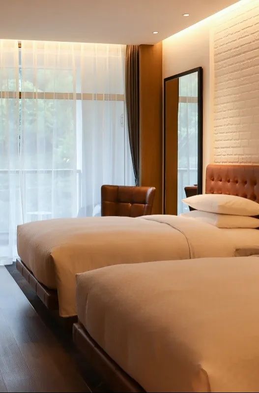 房间内面积37㎡,客房设计摩登复,原木深棕色调,搭配皮质的沙发座椅床头,木质地板......简约质感十足,品质床垫助你深度好眠。