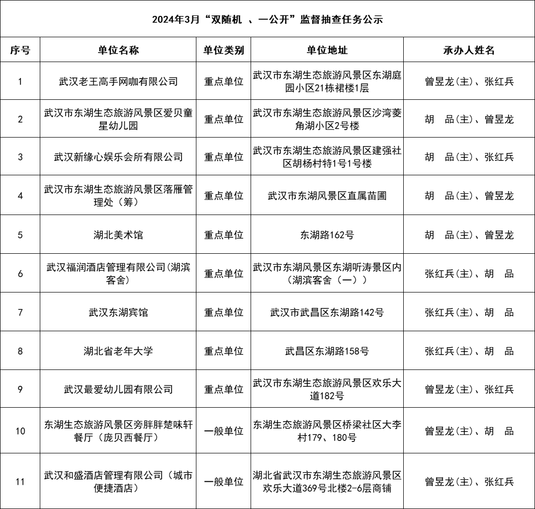 您现在的位置是:首页 > 国内旅游目的推荐 > 正文 国内旅游目的推荐 东湖风景区消防救援大队2024年2月“双随机、一公开”监督抽查结果及2024年3月监督抽查任务公示 admin2024年03月03日 19:25:25国内旅游目的推荐110 根据《国务院关于在市场监管领域全面推行部门联合”双随机、一公开“监管的意见》(国发﹝2019﹞5号),针对东湖风景区被监管单位,联合“双随机、一公开”的监管形式逐一进行抽查,并将抽查事项、抽查计划、抽查结果进行全程公开,依法监管,阳光执法。 现将东湖风景区消防救援大队“双随机、一公开”2024年2月监督抽查结果及2024年3月检查计划公示如下: 2024年2月“双随机、一公开”监督抽查结果公示: 2024年3月“双随机、一公开”监督抽查任务公示:消防救援部门“双随机、一公开”监督抽查工作全过程对外开放,市民可免费预约参观。每次检查任务参观人数不超过3人,约满为止,每月5日前预约截止。联系人:蒋哲,联系方式:88711652。来源 // 武汉消防正式施行!和你的生活密切相关2024-03-01 武汉消防上好“消防安全开学第一课” ,助力平安校园2024-03-01 防火于未“燃”!警惕小火酿“大祸”...2024-03-01 转载请说明来源于"旅荐网",部分内容转载自网络,如有侵权请联系qlwl@foxmail.com删除 本文地址:https://www.15386.cn/post/16480.html 上一篇 【义工旅行】第 98 期|民宿客栈青旅打工换宿招募 下一篇 三亚经济圈“景区推荐游”|南湾猴岛景区 相关文章 近期宅基地踏勘行程安排 北京五日游和上海五日游,哪个行程安排更紧凑? 国乒最新行程安排:返回成都备战世乒赛,名单确定,樊振东可能缺席 五一出游必看!南京超全游玩攻略来了!一键查询最新消息! 适合自己旅行的三座城市,无需攻略,现在就出发住几天! 乐山市旅行新攻略!小众场馆与特色美食,惊艳所有游客 旅游攻略 | 甘南4日深度游路线推荐: 转经、徒步、住石城…… 尼泊尔旅行超全攻略 旅行计划第二站——花花山 三四月周末出游指南:解锁国内小众秘境,承包你的春日浪漫! 发表评论 取消回复 评论列表 这篇文章还没有收到评论,赶紧来抢沙发吧~