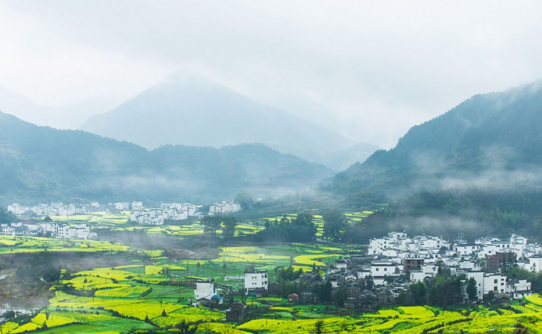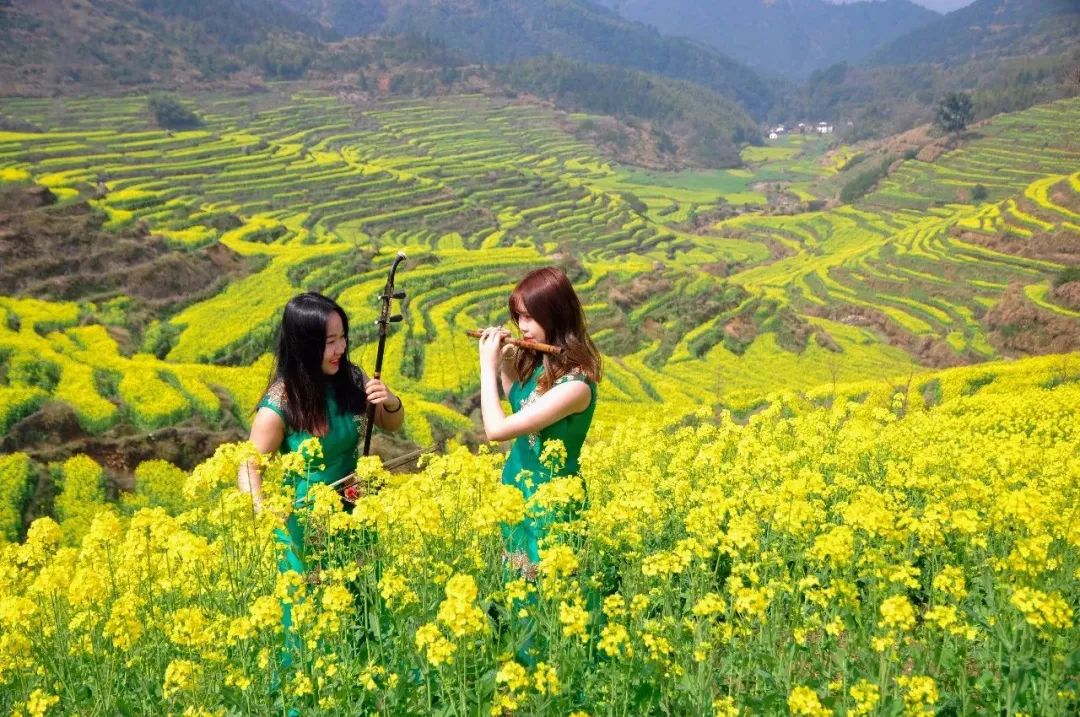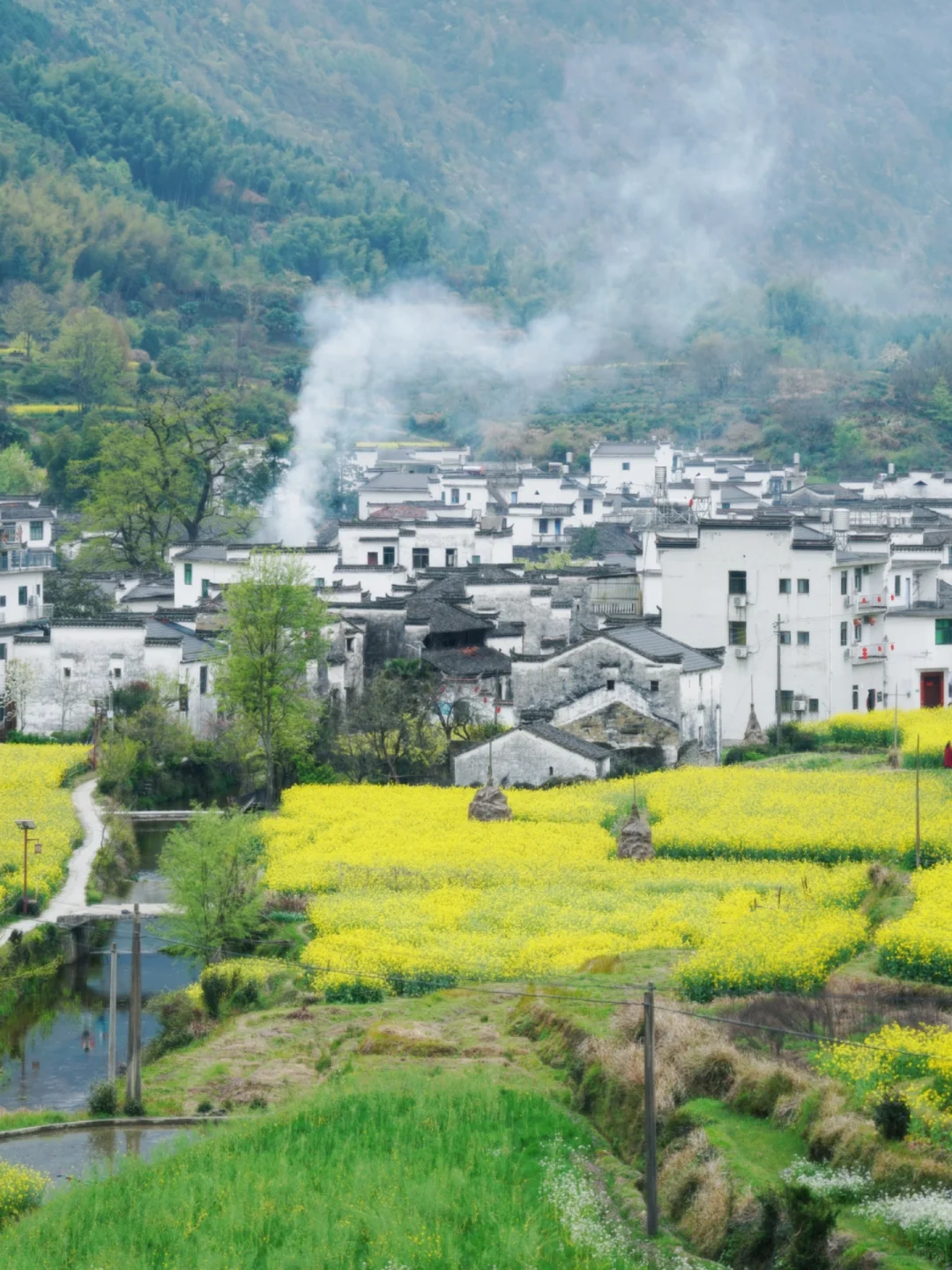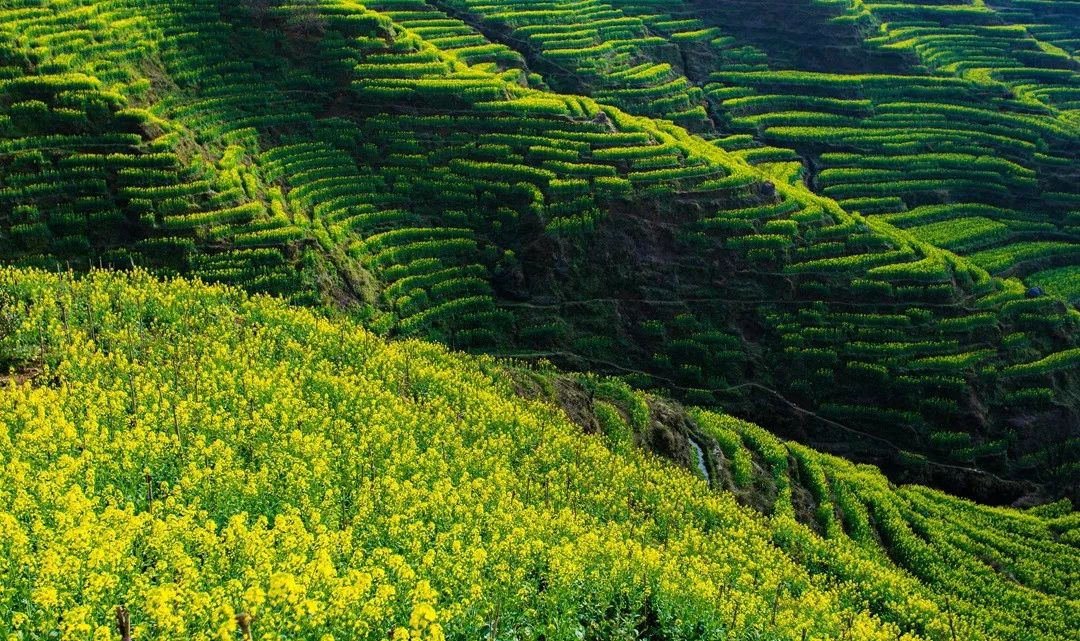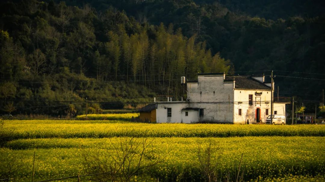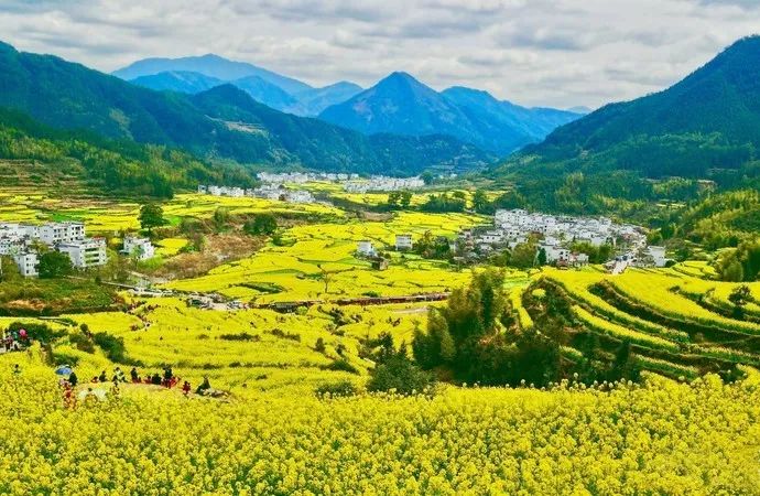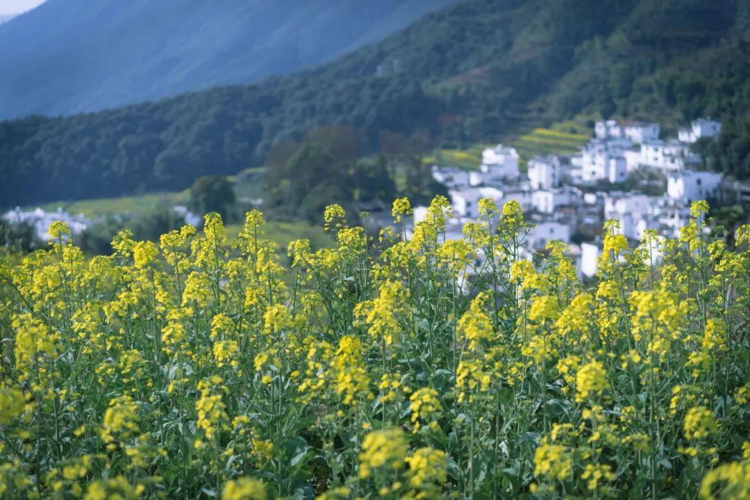 油菜花沿着梯田层层分布,错落有致。中间掩映着白墙灰瓦的徽派建筑,每一个逃离纷繁城市的人都能找到归宿。