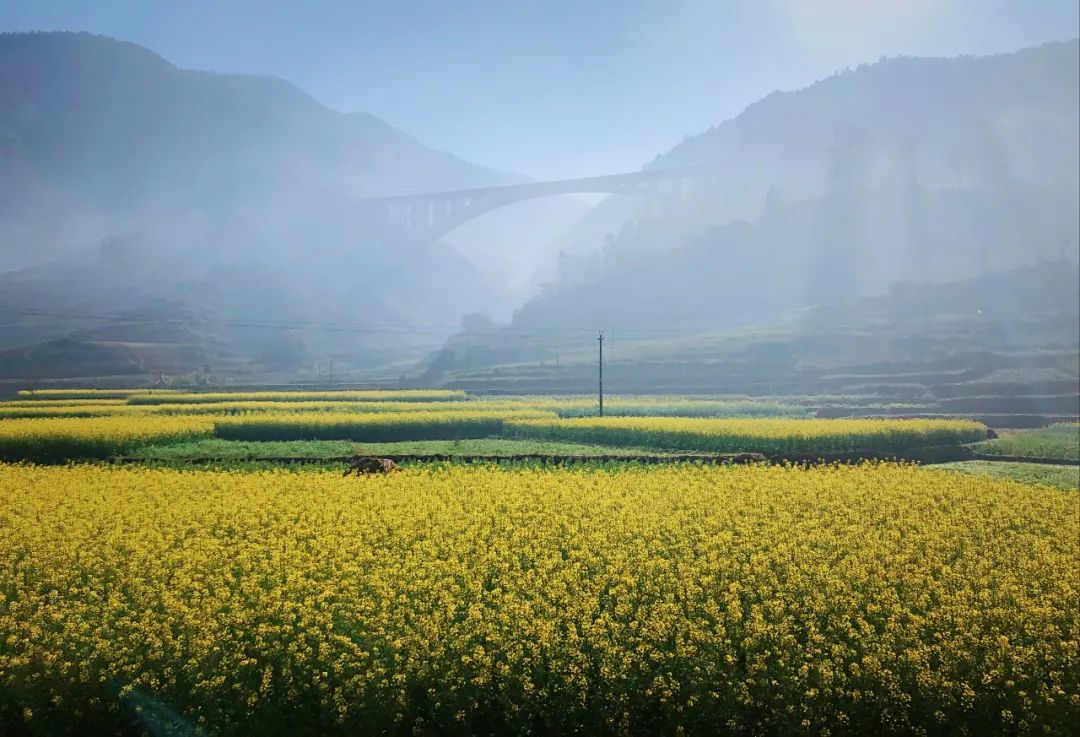 清晨的山谷,晨雾弥漫山间,远处山峦重叠,待到云雾散去,站在山顶的观景台远眺,漫山遍野的油菜花层层叠叠,一望无际的金黄色如瀑布般从山顶倾泻到山谷。