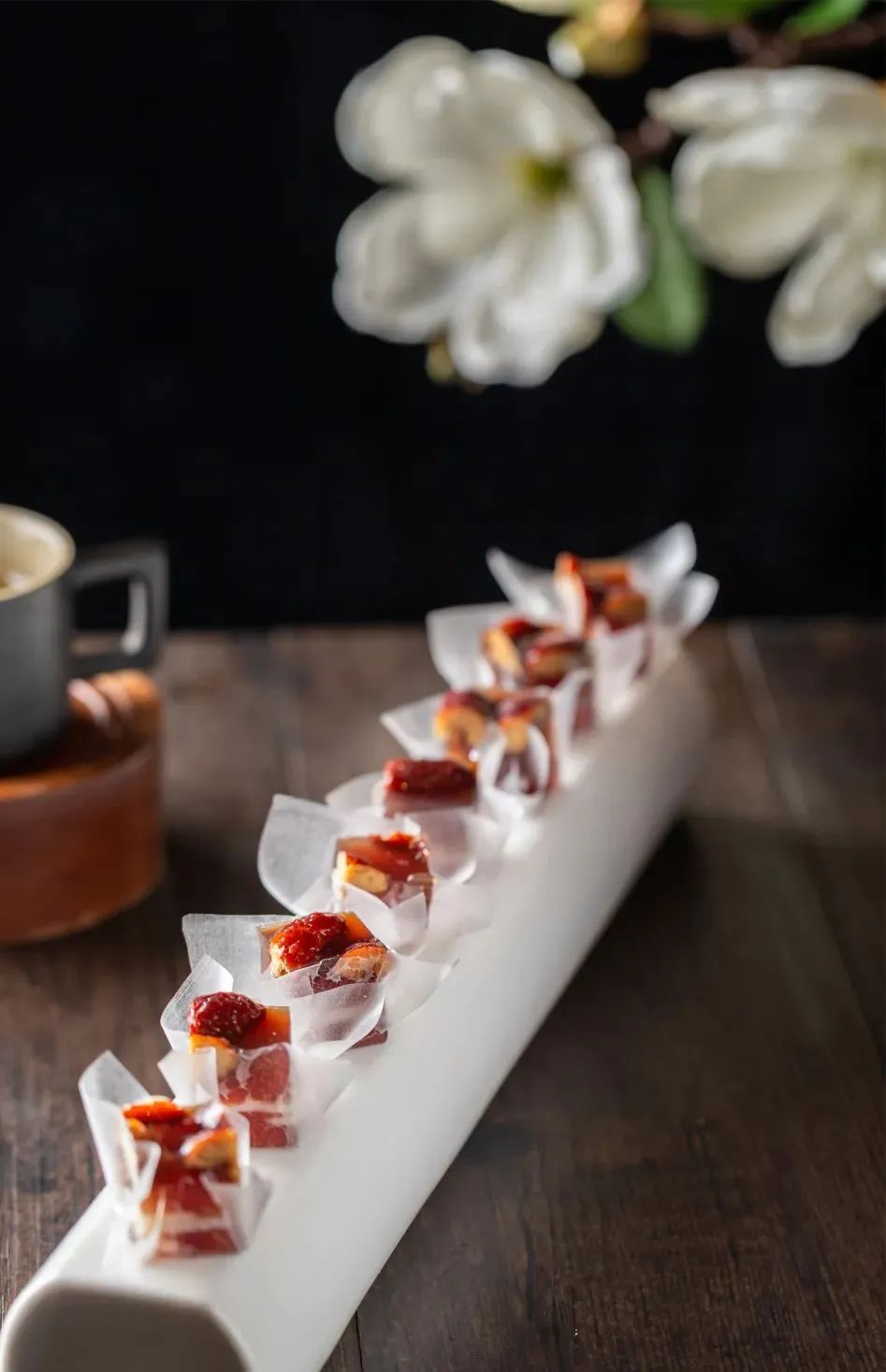 糖霜半撒,金箔碎粒,小风车的形状。