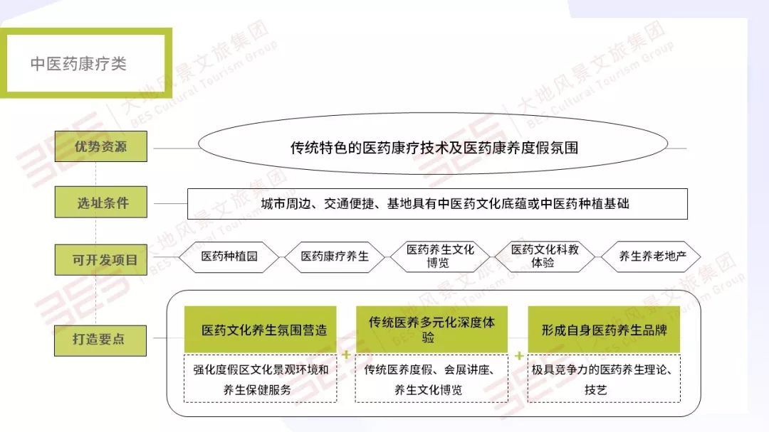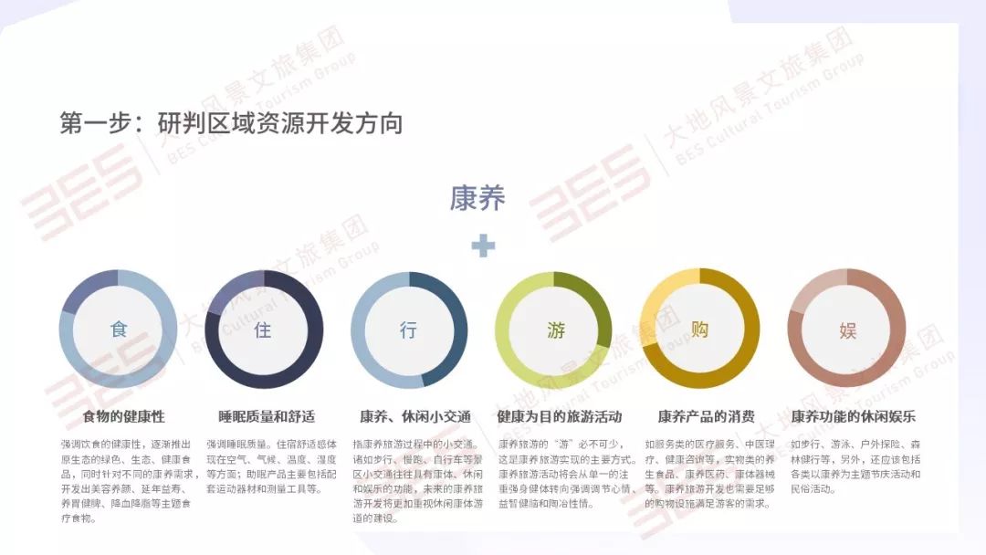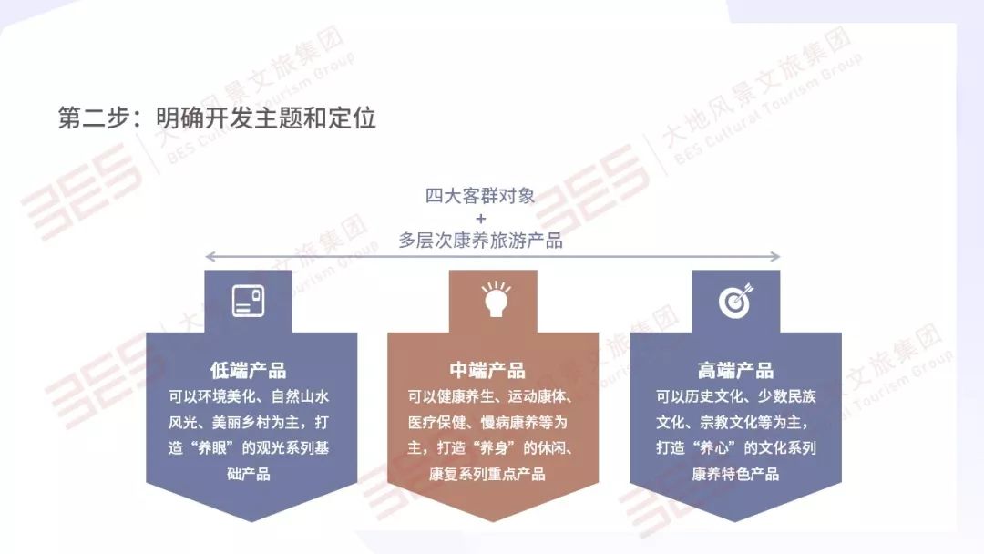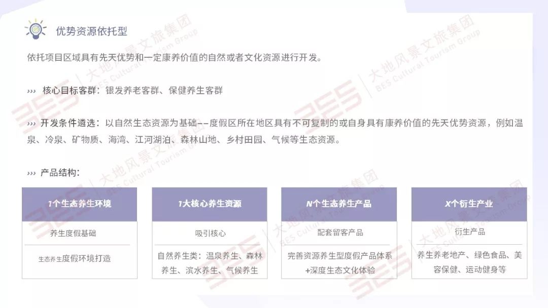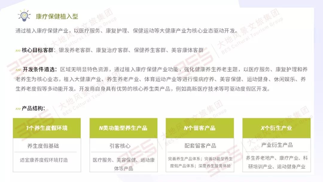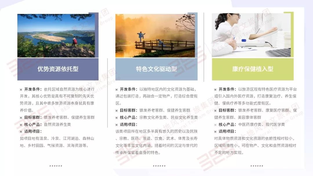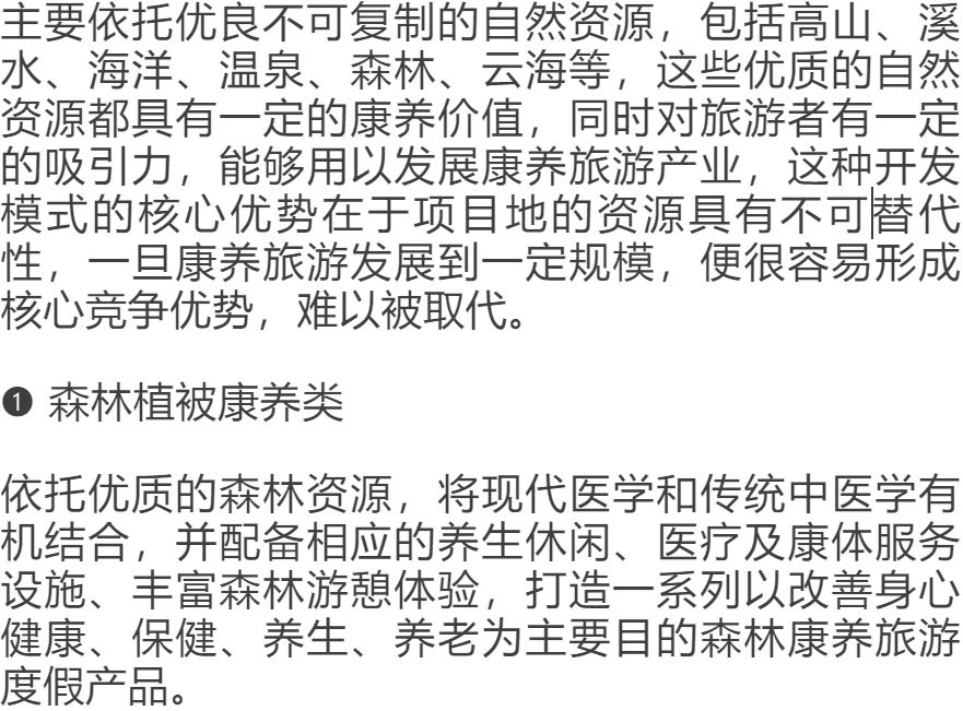 何为“康养”?“康”是方向,“养”是过程。一直以来,提到康养,经常会有一个误区,认为“康养=健康+养老”。实际上,康养是“健康”和“养生”的集合。康养旅游的开发模式分为三类,分别为优势资源依托型、特色文化驱动型和康疗保健植入型。以乡村、田园为生活空间,以农作、农事、农活为生活内容,以农业生产和农村经济发展为生活目标,回归自然、享受生命、修身养性、度假休闲、健康身体、治疗疾病、颐养天年的一种康养度假方式。田园养生度假开发要注重田园、自然、村庄三者的有机结合,以田园为主,以村庄为次,以自然为补充,以“田园的村庄化和村庄的田园化”,来发挥田园的空间载体作用。主要依托项目地独特的文化资源,如佛教文化、道教文化、茶文化、长寿文化、武术文化等,这些文化可以陶冶情操,有助于修身养性,放松身心,通过丰富多彩的文化体验活动,最终达到康养的目的,这种模式围绕某一种或几种文化资源进行开发,最终形成文化康养品牌。利用道教、佛教等宗教传统中饱含的丰富的养生、绿色医疗、自然保健、自我身心保养等资源,深度挖掘项目地独有的宗教、民俗、历史文化,结合市场需求及现代生活方式,打造利于养心的精神层面的旅游产品。满足人们观光游览、审美欲望、精神需求和猎奇心理,在获得文化体验的同时,能够修身养性、回归本心、陶冶情操。利用历史、民族、茶道、饮食、武术、体育、文学、书法等传统文化中包含的陶冶情操、强身健体、修身养性等丰富的文化内涵,结合市场需求及现代生活方式,打造利于放松身心、缓减压力、治疗亚健康状态的精神层面的旅游产品,满足人们观光休闲、文化体验、养生度假的需求。文化和自然资源不突出的区域,以旅游区现有特色医疗资源为平台或引入国内外医疗资源,打造康复治疗、养生保健、慢病疗养、旅游观光、休闲度假等多功能式度假区,开展SPA、瑜伽、推拿、中医药保健、现代医疗、医学美容等。依托中医药资源以及养生保健服务设施,以中医药文化独具特色的理论体系和内容为基础,将现代科技和古代中医养生理论相结合,在环境适宜的旅游度假区实现中医养生,增强体质,修身养性的度假生活方式。以医护疗养、康复休养为主题的旅游。依托适宜的气候资源、医药资源、现代中西医疗技术资源等,将优质的医疗康复咨询服务与旅游度假结合,以中西医疗、心理咨询、康复护理、医药医疗科技、医疗设备、复健器材、居家护理设备等内容为核心。一般分为以保健养生为主的疗养旅游,和以疾病疗愈为主的治愈旅游。在达到治疗目的的同时进行康复、疗养、观光、度假。康养产业对区域资源依赖性较强,因此首先要明确可依托现有资源开发的康养旅游产品体系,再适当引入对当地资源无依赖的技术手段与方法等,形成完善的产品组合。开发过程中需要从旅游“食住行游购娱”要素角度出发,全方位与康养旅游产品结合,增加游客的互动性和体验性。❷ 划分产品层次:针对不同人群消费需求,打造高、中、低档多层次旅游产品康养旅游产品应该遵循旅游发展规律和旅游市场的需求,分层次和成体系科学地打造,康养旅游产品应分为高、中、低端旅游产品。这些产品按一定的比例配置,满足多层次的康养旅游市场需求,最终把项目地打造成为康养旅游目的地。将项目地现有产业统一向康养产业靠拢转型,布局全面的康养产业系统,提高现有产业的市场高度和发展潜力,促进形成康养产业的品牌效应,为项目地康养旅游、全域旅游提供区别于周边市场的、独特的产业基础。第四步:与其他休闲产业和新型业态联动融合发展,打造区域康养产业集群构建一系列“康养+”模式,形成康养旅游多点开花的局面,为健康与旅游融合发展提供坚实的基础。基于动态资源观和产业联动融合观,推进康养旅游与其他现代休闲业和新型业态的全面融合,发展密切相关的休闲度假、康体疗养、养生养老、旅游社区等健康产业经济。构建一个“康养旅游产业集群”,推进和完善康养旅游产业链与产业集群,实现区域旅游业向休闲度假旅游的发展转型。第五步:构建区域康养旅游共同体,实现康养旅游全域发展康养旅游强调的是达到全面舒畅身心的目的,因此应该突破以往景区景点旅游单个独立发展的模式,充分挖掘项目地与项目地之间的过渡地带资源的康养价值,将区域打造成为一个产品丰富、产业完善、服务健全、营销多维的“康养旅游共同体”。总结:通过对康养旅游发展模式、产品形态等分析,我们也不难看出,康养本身不仅仅只是一种产业,更是一种健康生活的方式与理念,需要与多种业态融合,能以多种形式与载体呈现。康养旅游也正是健康养生与不同旅游业态融合发展的结果和体现。因此,需要以“康养+旅游+X”的模式不断创造出更加丰富的新型业态,推进康养产业的全面与持续发展。