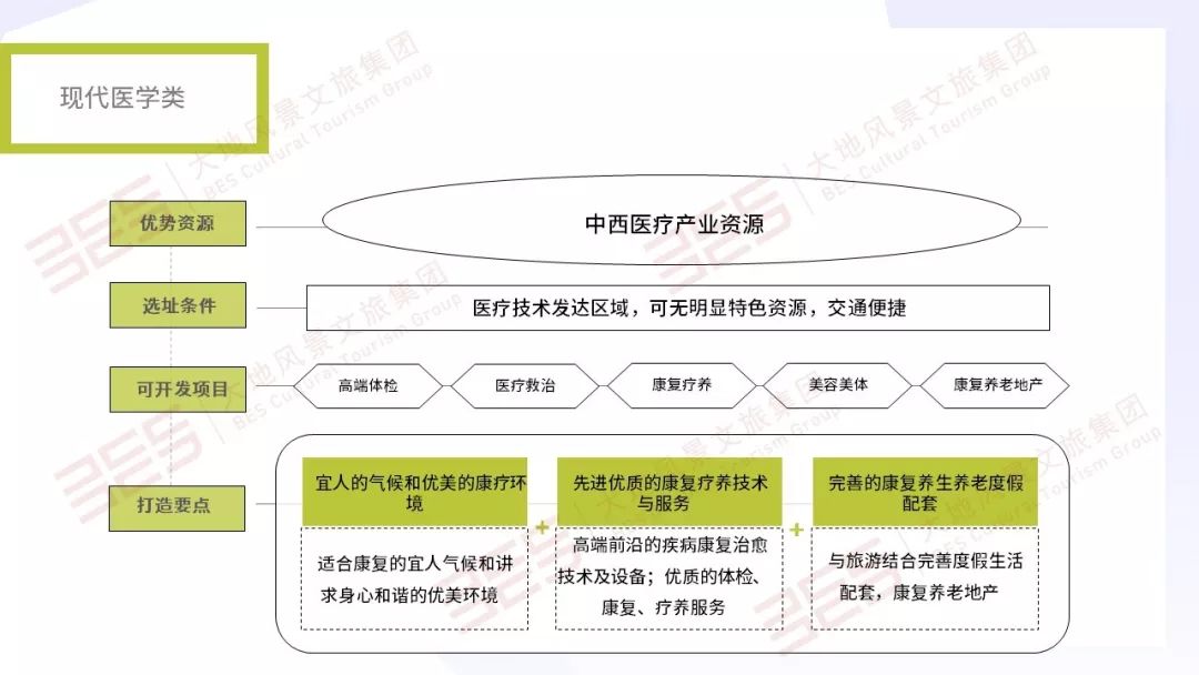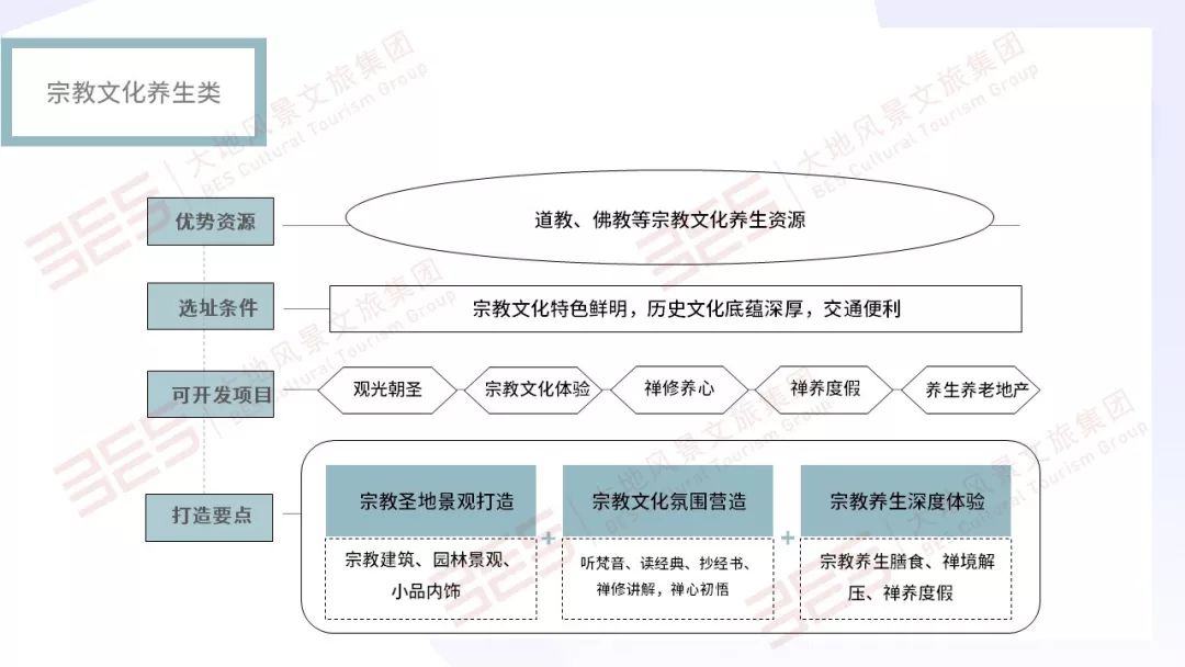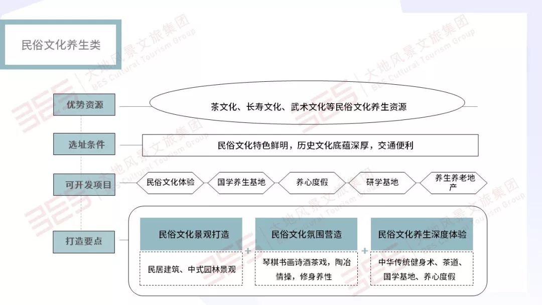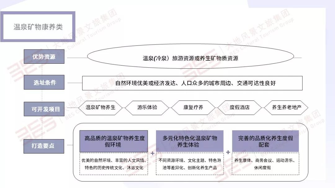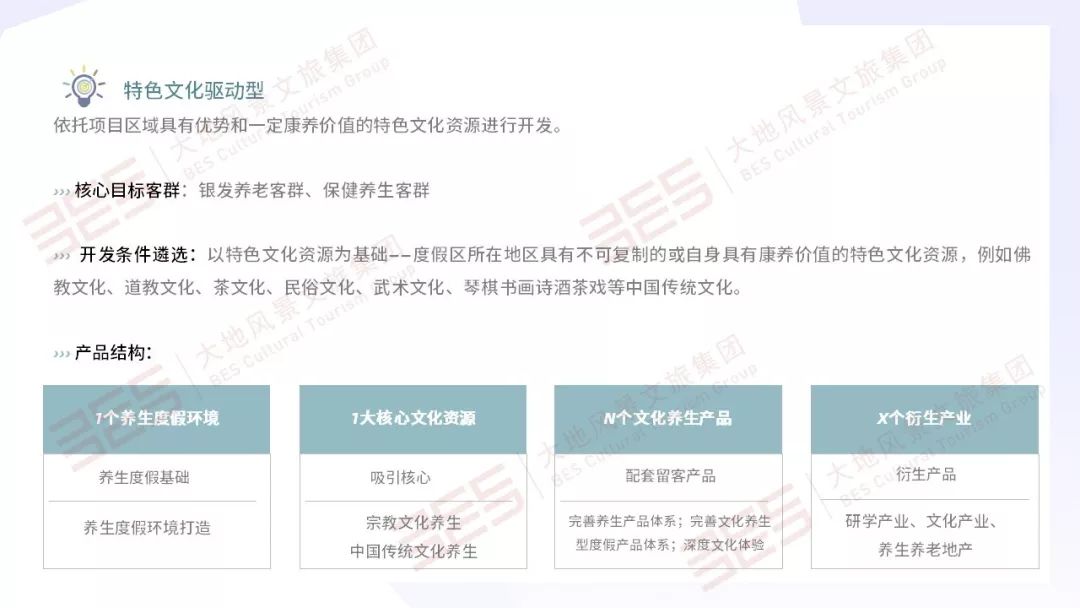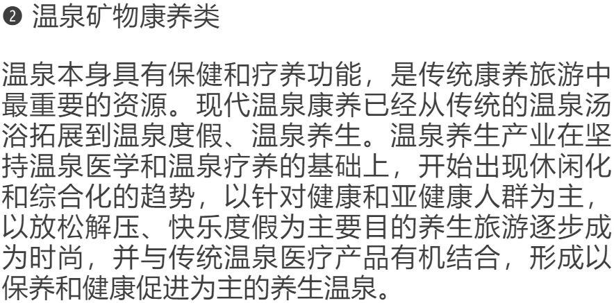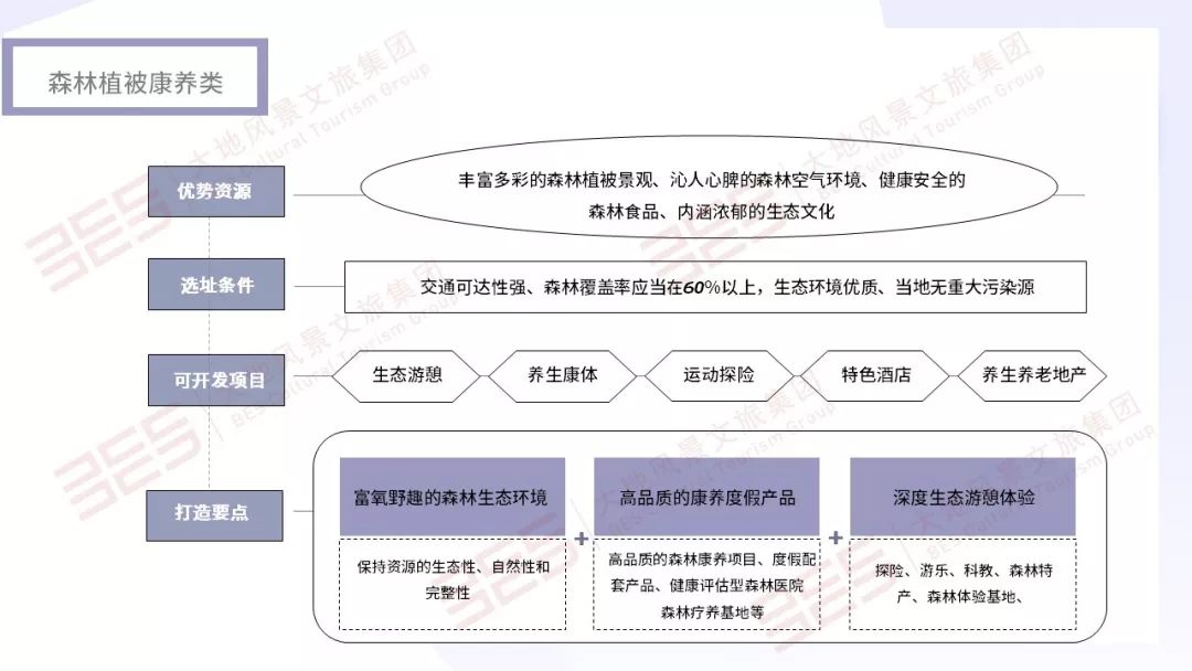 何为“康养”?“康”是方向,“养”是过程。一直以来,提到康养,经常会有一个误区,认为“康养=健康+养老”。实际上,康养是“健康”和“养生”的集合。康养旅游的开发模式分为三类,分别为优势资源依托型、特色文化驱动型和康疗保健植入型。以乡村、田园为生活空间,以农作、农事、农活为生活内容,以农业生产和农村经济发展为生活目标,回归自然、享受生命、修身养性、度假休闲、健康身体、治疗疾病、颐养天年的一种康养度假方式。田园养生度假开发要注重田园、自然、村庄三者的有机结合,以田园为主,以村庄为次,以自然为补充,以“田园的村庄化和村庄的田园化”,来发挥田园的空间载体作用。主要依托项目地独特的文化资源,如佛教文化、道教文化、茶文化、长寿文化、武术文化等,这些文化可以陶冶情操,有助于修身养性,放松身心,通过丰富多彩的文化体验活动,最终达到康养的目的,这种模式围绕某一种或几种文化资源进行开发,最终形成文化康养品牌。利用道教、佛教等宗教传统中饱含的丰富的养生、绿色医疗、自然保健、自我身心保养等资源,深度挖掘项目地独有的宗教、民俗、历史文化,结合市场需求及现代生活方式,打造利于养心的精神层面的旅游产品。满足人们观光游览、审美欲望、精神需求和猎奇心理,在获得文化体验的同时,能够修身养性、回归本心、陶冶情操。利用历史、民族、茶道、饮食、武术、体育、文学、书法等传统文化中包含的陶冶情操、强身健体、修身养性等丰富的文化内涵,结合市场需求及现代生活方式,打造利于放松身心、缓减压力、治疗亚健康状态的精神层面的旅游产品,满足人们观光休闲、文化体验、养生度假的需求。文化和自然资源不突出的区域,以旅游区现有特色医疗资源为平台或引入国内外医疗资源,打造康复治疗、养生保健、慢病疗养、旅游观光、休闲度假等多功能式度假区,开展SPA、瑜伽、推拿、中医药保健、现代医疗、医学美容等。依托中医药资源以及养生保健服务设施,以中医药文化独具特色的理论体系和内容为基础,将现代科技和古代中医养生理论相结合,在环境适宜的旅游度假区实现中医养生,增强体质,修身养性的度假生活方式。以医护疗养、康复休养为主题的旅游。依托适宜的气候资源、医药资源、现代中西医疗技术资源等,将优质的医疗康复咨询服务与旅游度假结合,以中西医疗、心理咨询、康复护理、医药医疗科技、医疗设备、复健器材、居家护理设备等内容为核心。一般分为以保健养生为主的疗养旅游,和以疾病疗愈为主的治愈旅游。在达到治疗目的的同时进行康复、疗养、观光、度假。康养产业对区域资源依赖性较强,因此首先要明确可依托现有资源开发的康养旅游产品体系,再适当引入对当地资源无依赖的技术手段与方法等,形成完善的产品组合。开发过程中需要从旅游“食住行游购娱”要素角度出发,全方位与康养旅游产品结合,增加游客的互动性和体验性。❷ 划分产品层次:针对不同人群消费需求,打造高、中、低档多层次旅游产品康养旅游产品应该遵循旅游发展规律和旅游市场的需求,分层次和成体系科学地打造,康养旅游产品应分为高、中、低端旅游产品。这些产品按一定的比例配置,满足多层次的康养旅游市场需求,最终把项目地打造成为康养旅游目的地。将项目地现有产业统一向康养产业靠拢转型,布局全面的康养产业系统,提高现有产业的市场高度和发展潜力,促进形成康养产业的品牌效应,为项目地康养旅游、全域旅游提供区别于周边市场的、独特的产业基础。第四步:与其他休闲产业和新型业态联动融合发展,打造区域康养产业集群构建一系列“康养+”模式,形成康养旅游多点开花的局面,为健康与旅游融合发展提供坚实的基础。基于动态资源观和产业联动融合观,推进康养旅游与其他现代休闲业和新型业态的全面融合,发展密切相关的休闲度假、康体疗养、养生养老、旅游社区等健康产业经济。构建一个“康养旅游产业集群”,推进和完善康养旅游产业链与产业集群,实现区域旅游业向休闲度假旅游的发展转型。第五步:构建区域康养旅游共同体,实现康养旅游全域发展康养旅游强调的是达到全面舒畅身心的目的,因此应该突破以往景区景点旅游单个独立发展的模式,充分挖掘项目地与项目地之间的过渡地带资源的康养价值,将区域打造成为一个产品丰富、产业完善、服务健全、营销多维的“康养旅游共同体”。总结:通过对康养旅游发展模式、产品形态等分析,我们也不难看出,康养本身不仅仅只是一种产业,更是一种健康生活的方式与理念,需要与多种业态融合,能以多种形式与载体呈现。康养旅游也正是健康养生与不同旅游业态融合发展的结果和体现。因此,需要以“康养+旅游+X”的模式不断创造出更加丰富的新型业态,推进康养产业的全面与持续发展。