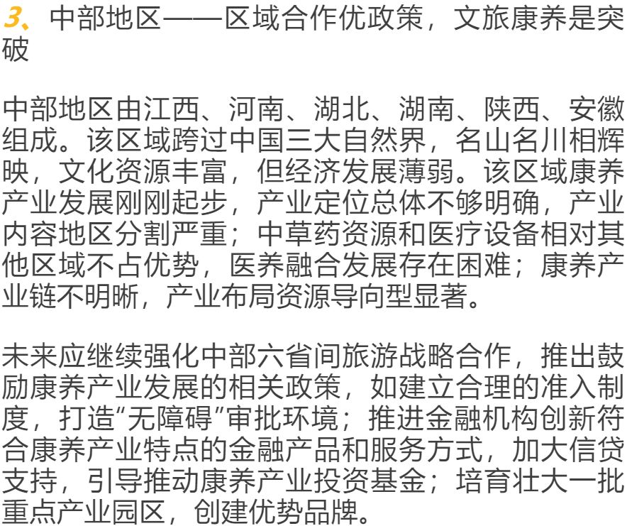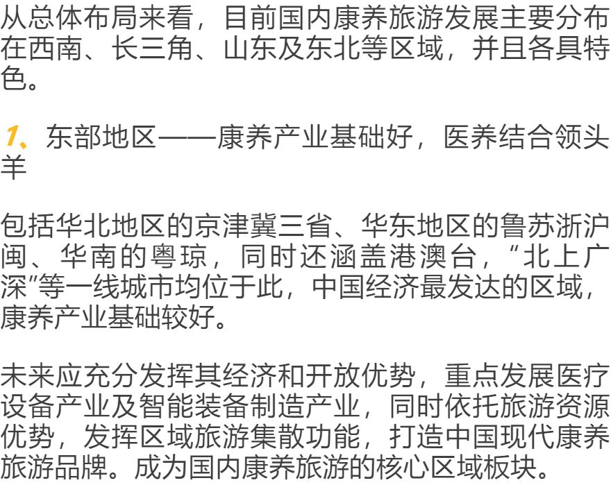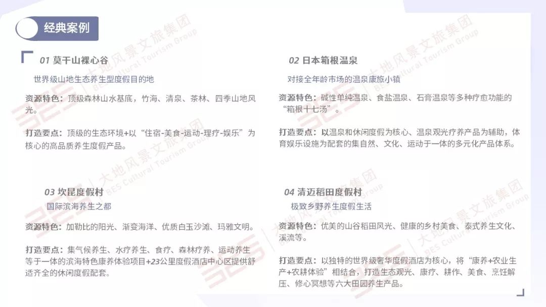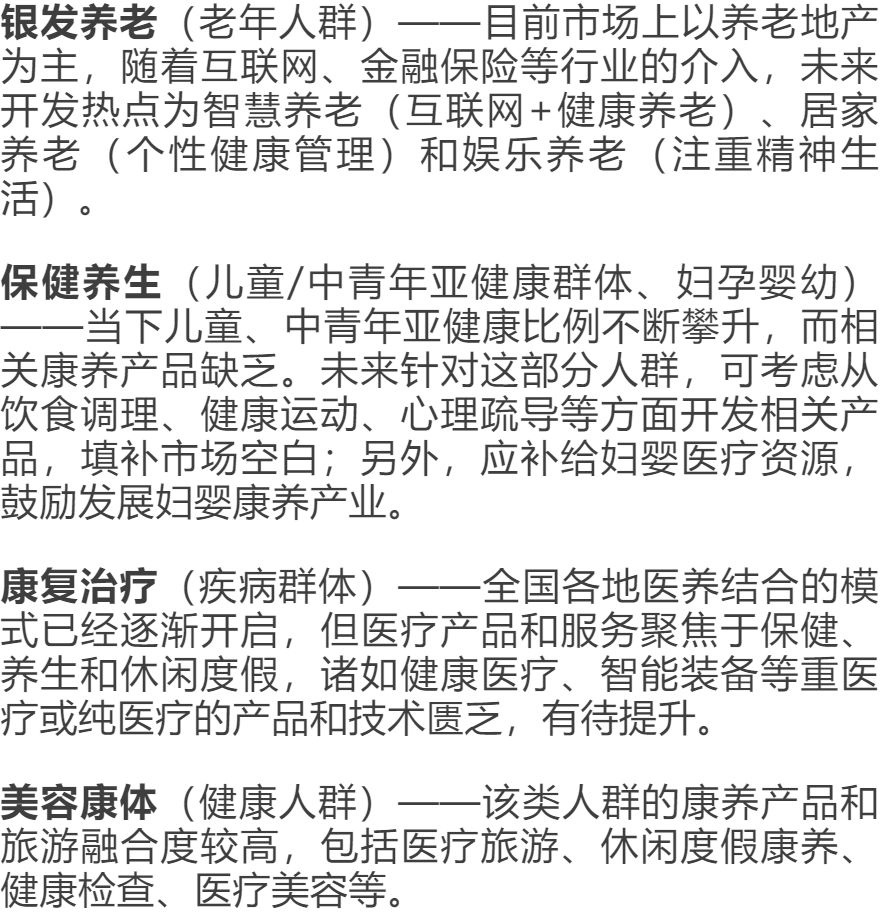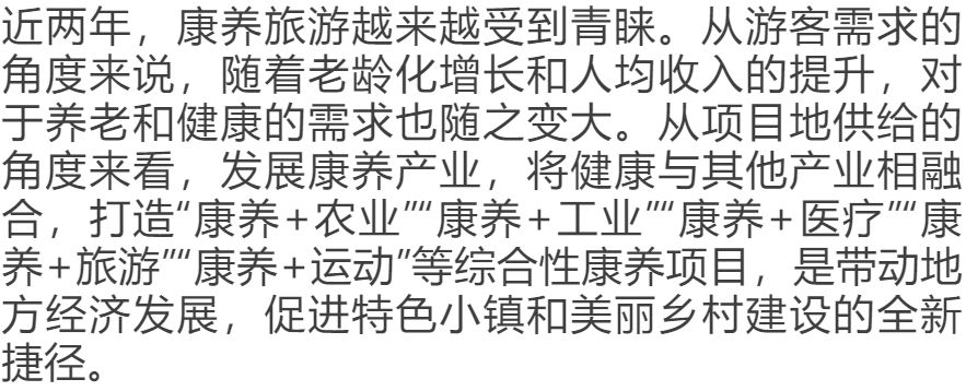 活动关注:【京津冀】2024年3月16~18日中国医养康旅产业融合发展标杆项目深度考察 (可在文章尾部查看)在多方市场需求推动、优良资源本底支撑,以及顶层政策设计的利好引导下,康养旅游发展前景大好,新时期我国旅游业发展及围绕康养的相关产业也将迎来一片新蓝海。但是如果想要成功打造康养旅游项目,我们需要破除1个误区,看懂4大格局、分析3大模式、采取5个步骤。