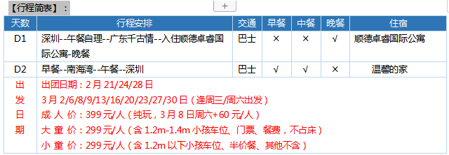第一天:深圳--午餐自理--广东千古情--入住顺德卓睿国际公寓--晚餐13:00 前往体验【广东千古情】,一部“敢闯敢拼”广东精神的生动写照,一部波澜壮阔的民族传奇,一部“千古情”系列的集大成之作,一部中国旅游演艺的神来之笔!《广东千古情》不是一场传统的演艺秀,她想带来的不仅是一声喝彩、一句赞美,而是要把直击心灵的震撼与感动传递给每一位观众。从远古的西樵山出发,穿越漫漫的历史长河,有鼓角铮鸣,有百越欢歌,有江湖侠客的热血豪迈,有闯荡南洋的惊心动魄,还有那南国佳人、骑楼晚风……演出糅合了3D威亚、高速吸幕、大型线阵、巨型LED屏、智能数字系统等高科技手段,舞台幻化海洋,剧院秒变星空,千吨洪水扑面而来,万封侨批从天而降,在真真假假、虚虚实实之间,呈现出惊艳的歌舞艺术与感官体验,开创珠三角旅游演艺3.0大时代!