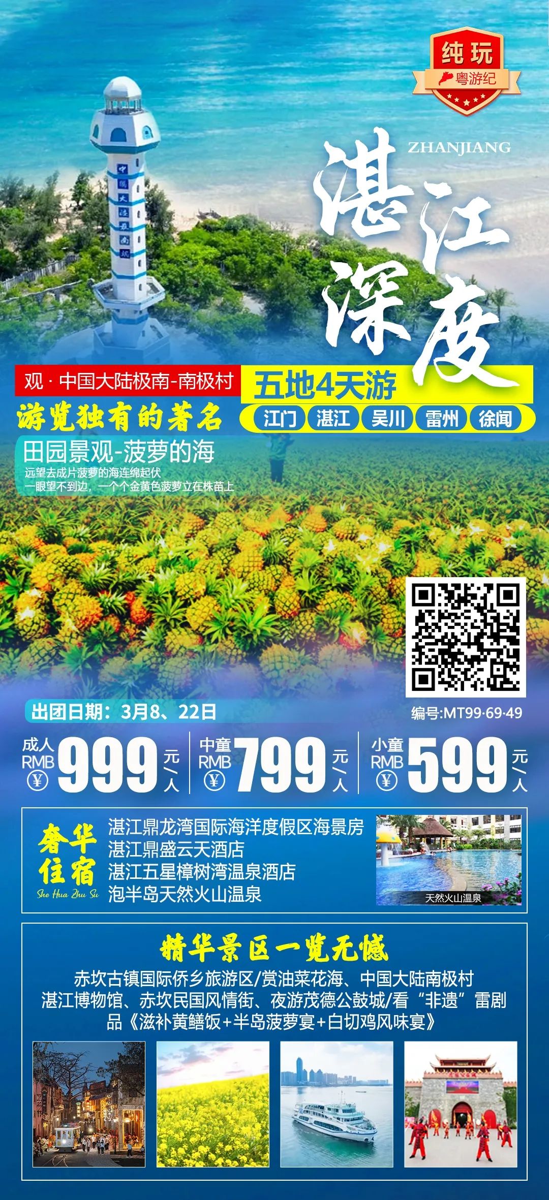 MT3【湛江深度纯玩4天】南极村/菠萝的海-收获季无限次浸泡半岛天然火山温泉、百亩油菜花盛开、海景酒店|市区五星|五星温泉酒店 999